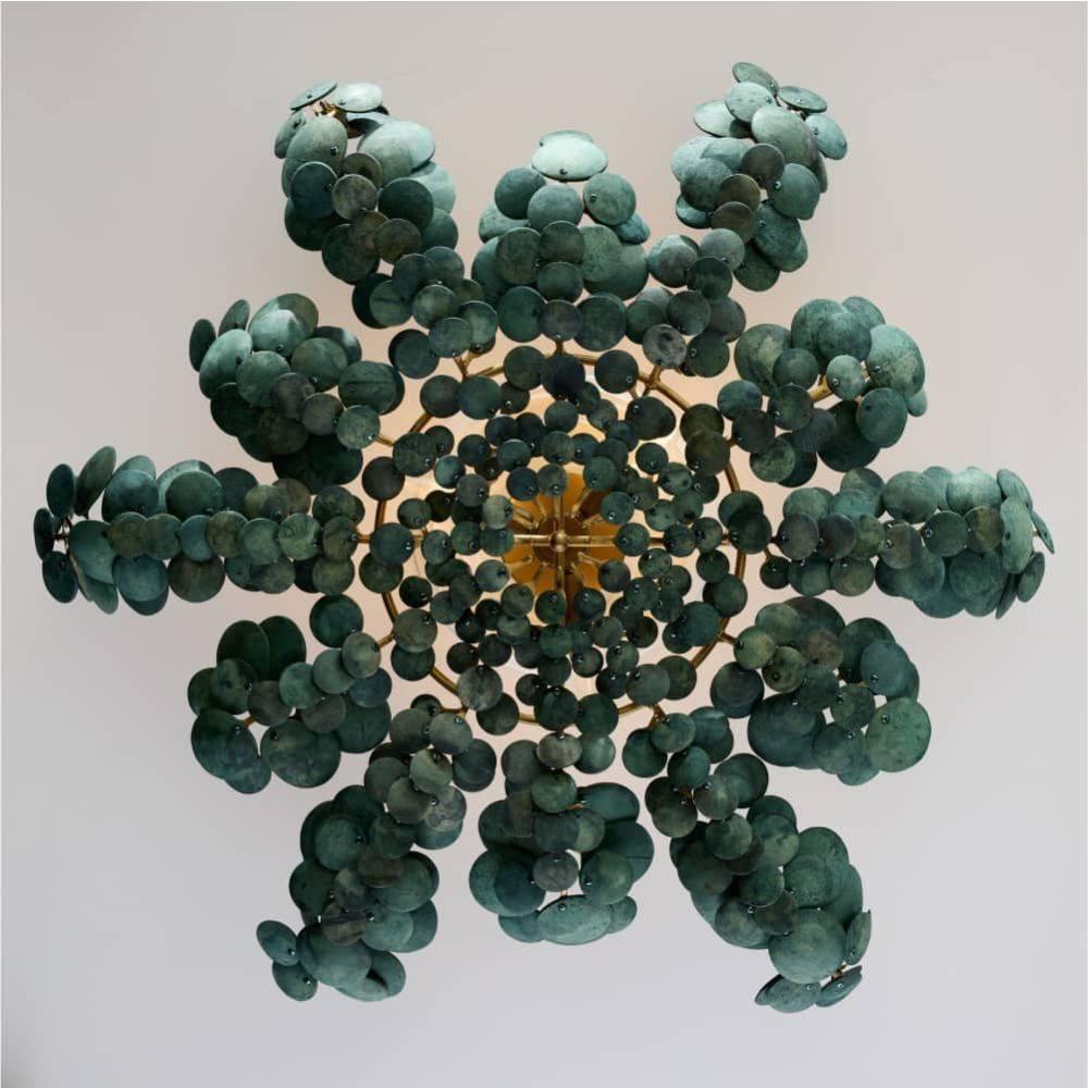 The lush allure of tropical foliage informs the Bilal. From afar, this botanically inspired fixture resembles metal but is cleverly made of sustainable coconut shell in a rich eucalyptus hue inspired by succulent plants. A stylish companion to our Bilal chandelier, it is suspended from an antique brass-plated iron canopy. Finish will vary.