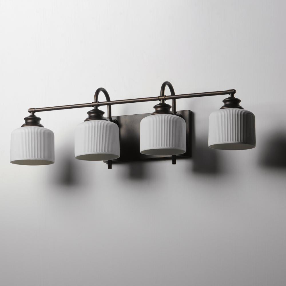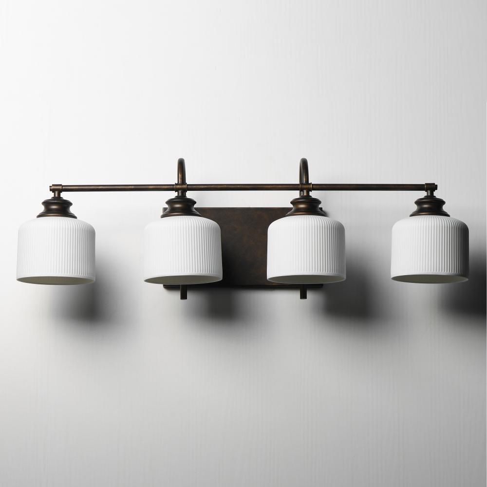 Ribbed ceramic shades are gracefully suspended on classic arching tube frames, creating a timeless yet modern design. The matte bisque-fired ceramic is translucent softly diffuses light while highlighting the ribbed raised pattern. Available in elegant fin