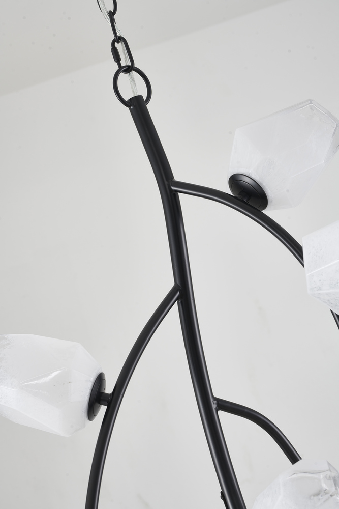 This chandelier is a black branch chandelier. It comes with white glass shades. The chain length of 70 inches is provided and the chain length is adjustable.