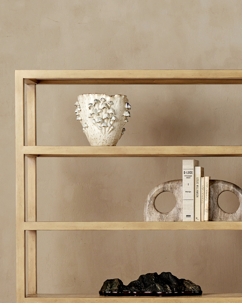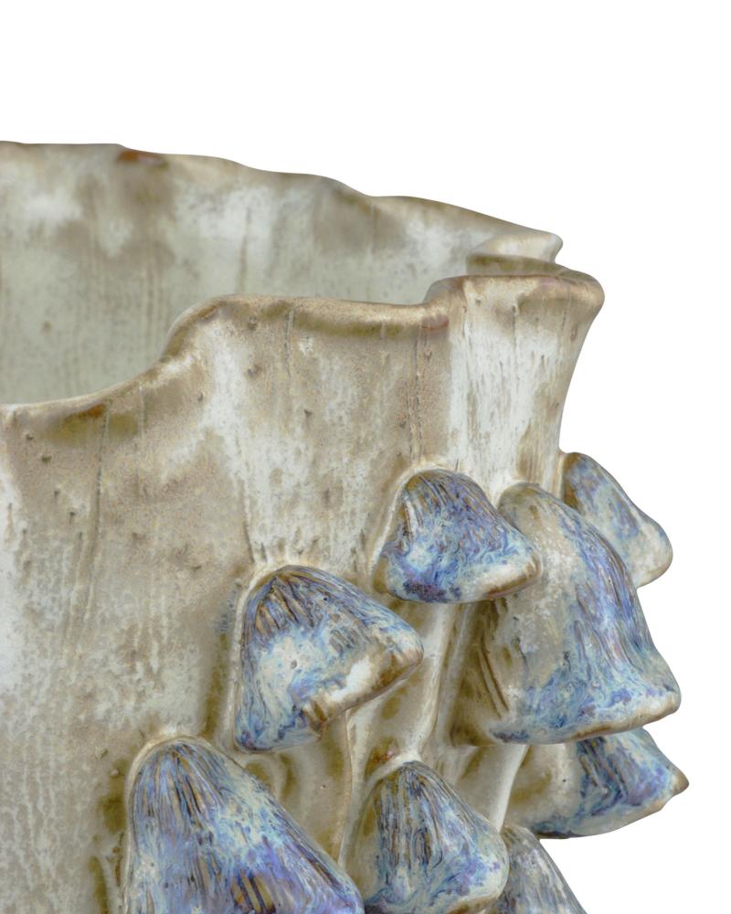 The Black Forest Mushrooms Large Ivory Vase is a vessel onto which fanciful mushrooms in a blue reactive glaze have been affixed. The expressive nature of the fungi makes this ivory vase whimsical and interesting. Made of ceramic by a group of women who live at the border of Burma and Thailand, the incredible hand-thrown vase is composed and then the decorative elements are put place, one-by-one, by hand.