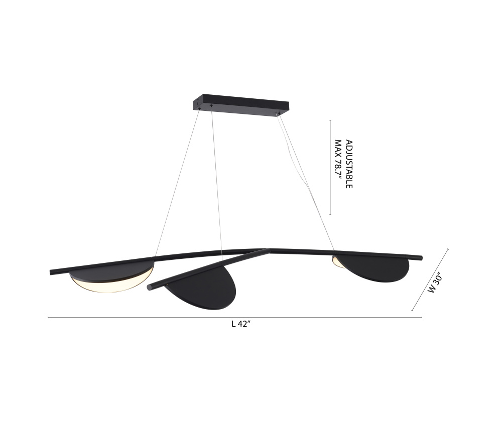 This 3-light LED pendant boasts a sleek and transitional design, featuring a black aluminum frame and white acrylic diffusers that will complement a wide range of decorating styles. With a warm and cozy 3000K color temperature, this light is perfect for creating a relaxing ambiance in any room. The LED technology used in this fixture is energy-efficient, using only 42W of power to produce a bright and even light. Measuring 63 inches wide and 30 inches depth, this pendant light is designed to make a statement in any space, whether it's a bedroom, living room, dinning, or entryway.