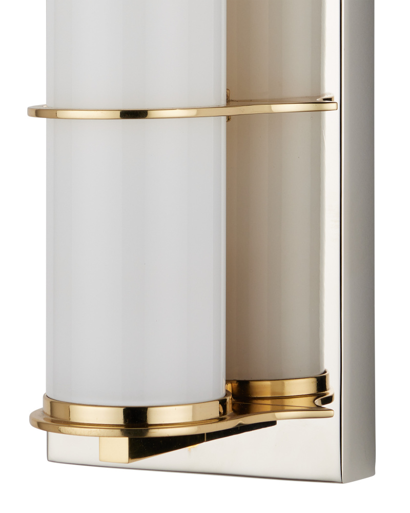 The Blaine Nickel Bath Wall Sconce has a tubular design, with a milky glass tube set into the metal rings in a polished brass finish that contrast the wallplate in a polished nickel finish. Perfect for lighting up a bathroom vanity, the Blaine has a simple design that will work well within a number of design styles.
