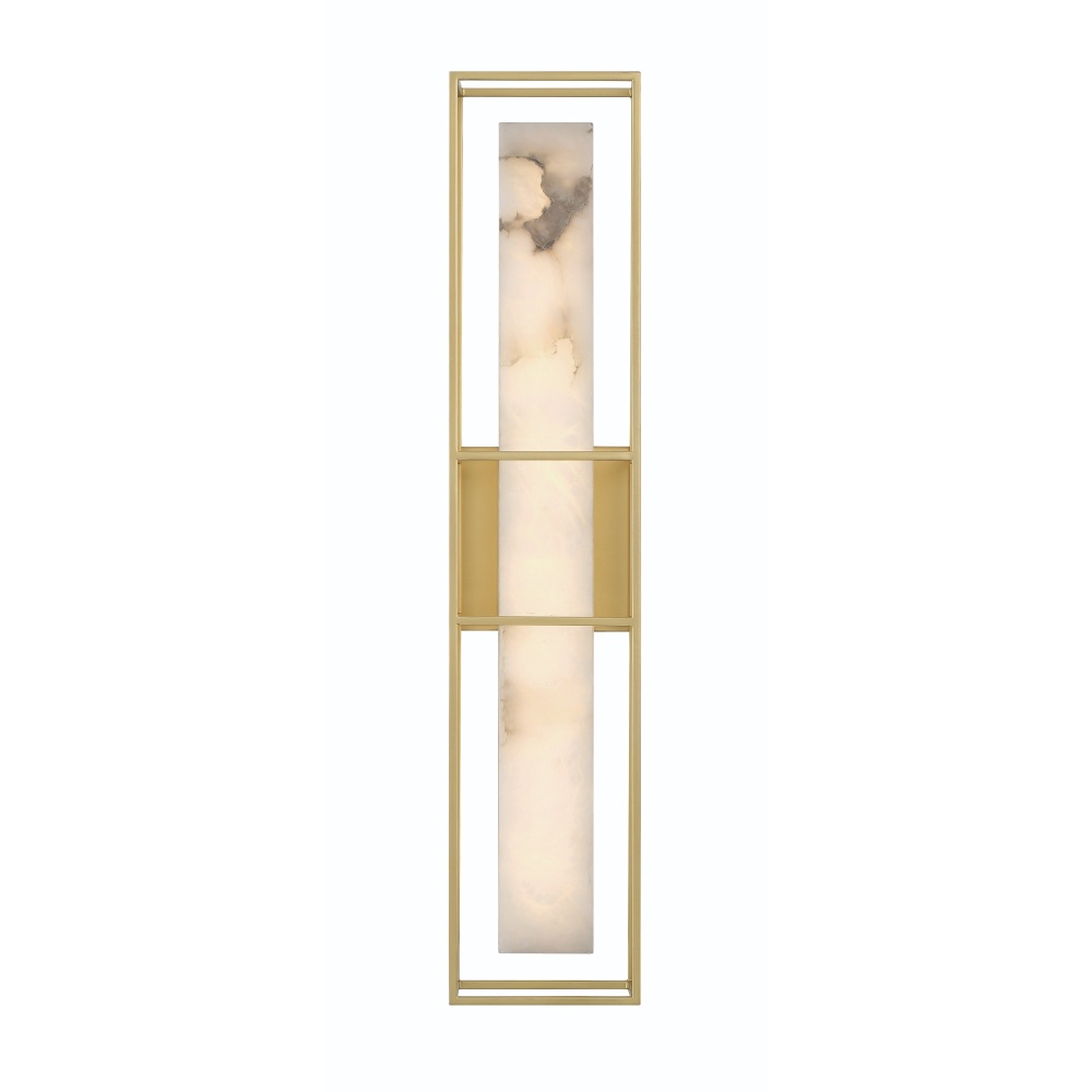 Organic and industrial have been combined. The softness of alabaster panels surrounded by the strength of a metal frame represent the yin and yang of a home…the warmth of the people safely ensconced inside the structural soundness of building, illuminated by blakely wall mounted lighting.