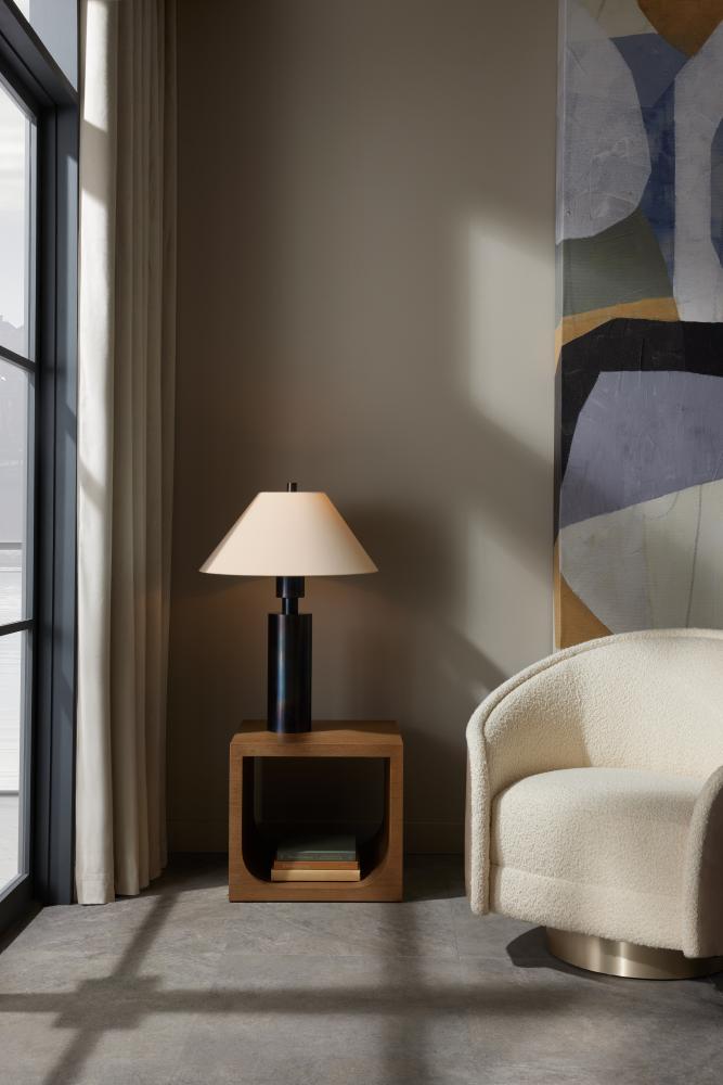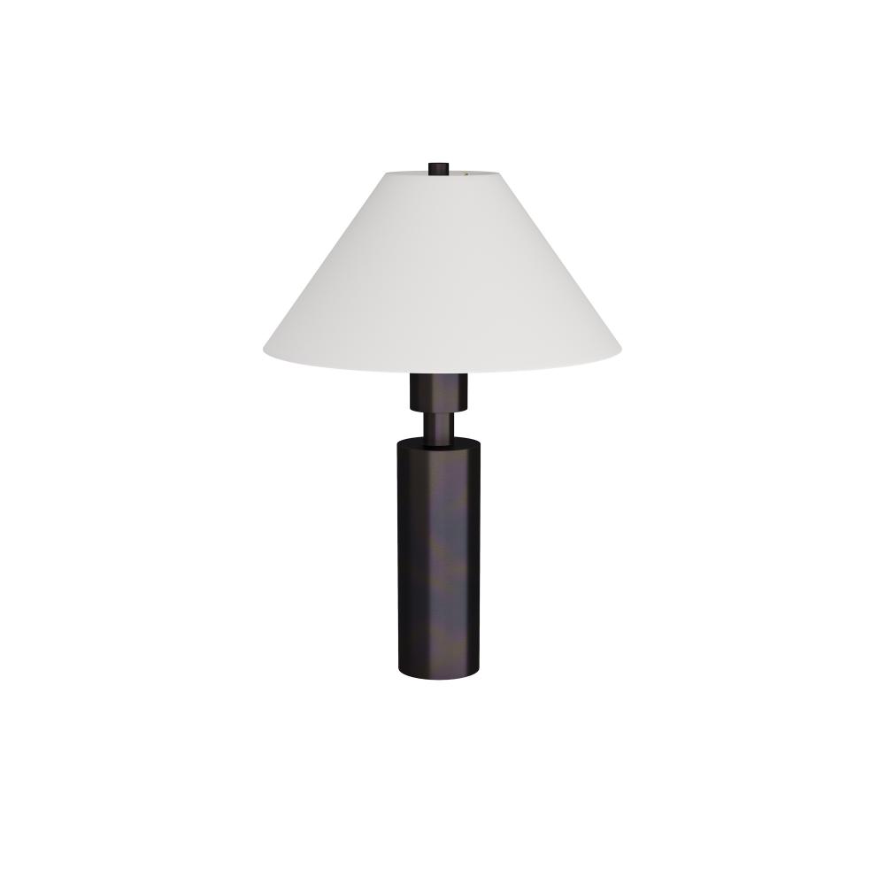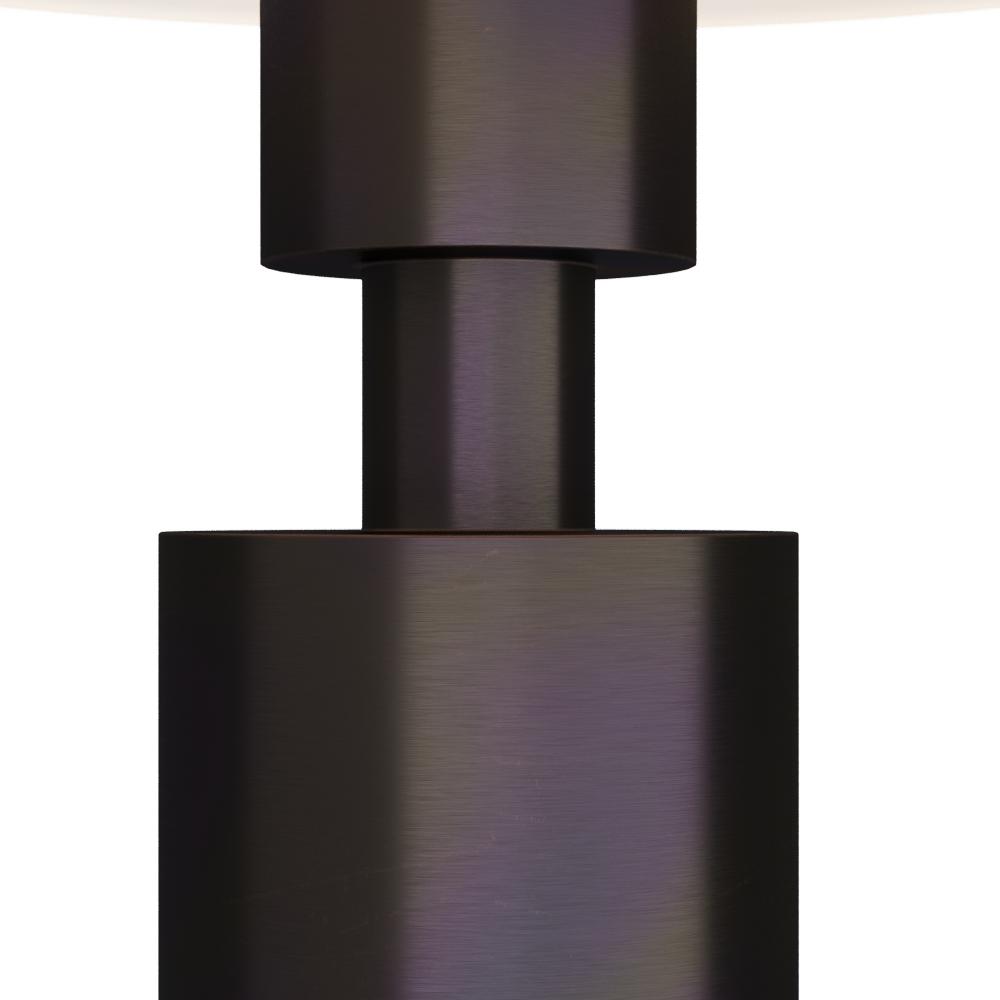 Craftsmanship at its finest, hot rolled steel is shaped into towered cylinders. Burnished to an oxidized finish, its impactful base perfectly complements a tapered shade of ivory microfiber. Finished with a clear silver cord and three-way rotary switch.