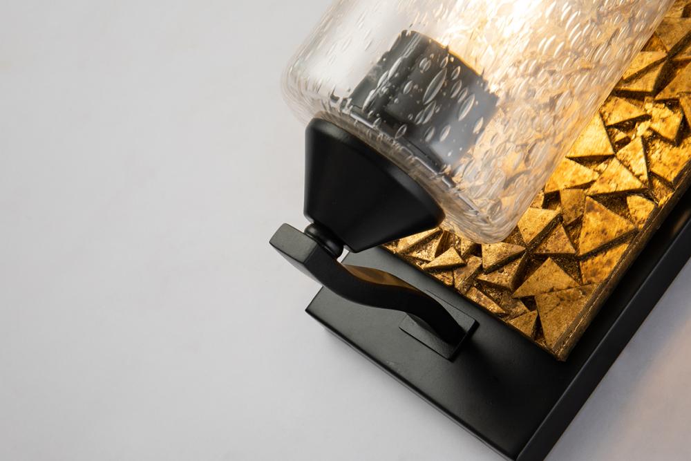 A sconce with a textured rectangle backplate in matte black and antiqued gold. Its cylinder seeded glass adds contemporary charm to hallways, bathrooms, or living rooms.