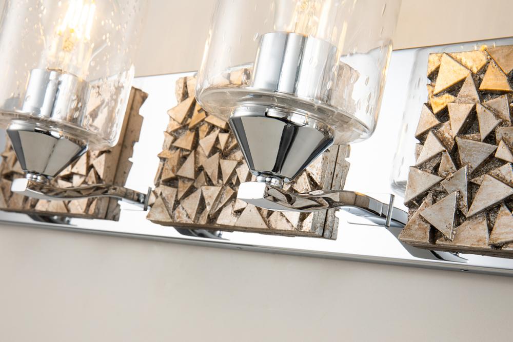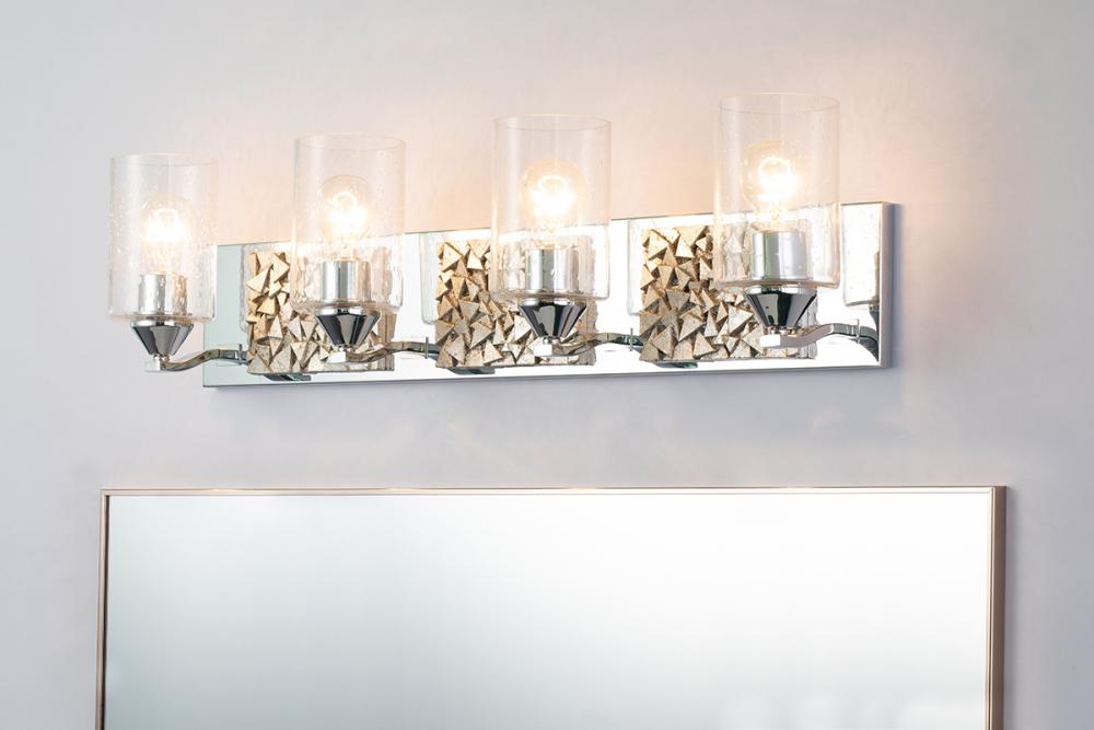 A 35" x 8" x 6.5" 4-light vanity in polished chrome and antique silver with a textured backplate and cylinder seeded glass. Brings contemporary texture to bathrooms.