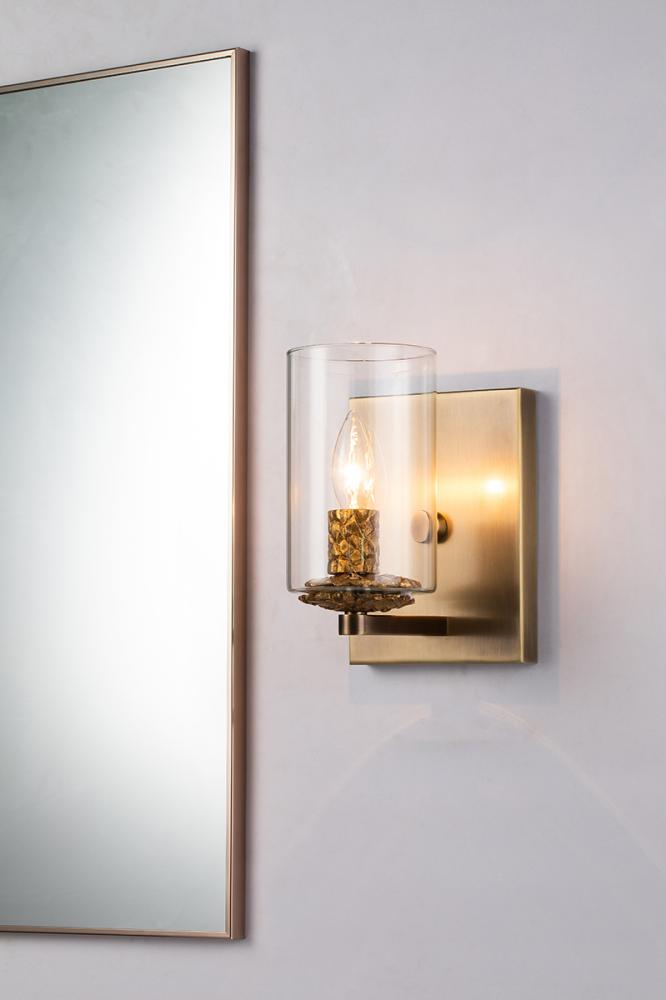 The Bolivar 1-Light Sconce blends vintage charm with modern style. Featuring mixed gold and antique brass finishes, a clear glass cylinder, and antique gold candle sleeve, it adds elegance to any space. The sleek brass backplate completes the look.