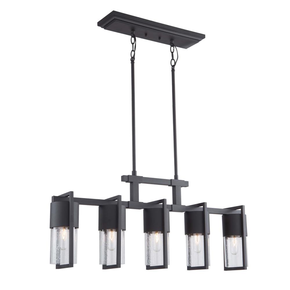 The Bond collection of outdoor luminaries features a black frame and cylindrical seeded clear glassware. Outdoor island 5 light chandelier shown. (This chandelier has matching wall sconces) This unit is back by a 25 year warranty on corrosion and 5 years on paint defects.