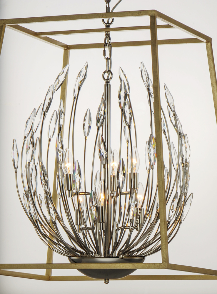 Metal frames finished in a lustrous Gold Leaf house a Polished Nickel bouquet of Beveled Crystal petals. The combination of gold, nickel, and crystal are dramatic elements that blend together in a homogenous fashion.