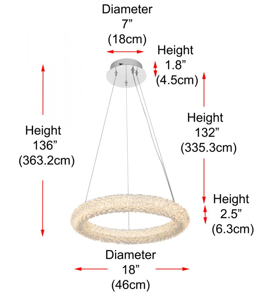 Elevate your space with our 18-inch LED Chandelier, a perfect blend of chic design and sophistication. Customize your lighting with an adjustable height from 10 to 136 inches. Experience a hassle-free installation with no assembly required. Choose from three color temperatures (3000K, 4500K, 6000K) to set the perfect mood for any occasion. Crafted with durable Iron and Crystal materials, this chandelier promises long-lasting reliability. ETL listed for safety compliance, it ensures a secure and reliable lighting solution. Embrace hassle-free brilliance with integrated LED technology, eliminating the need to buy bulbs for enduring and maintenance-free illumination."