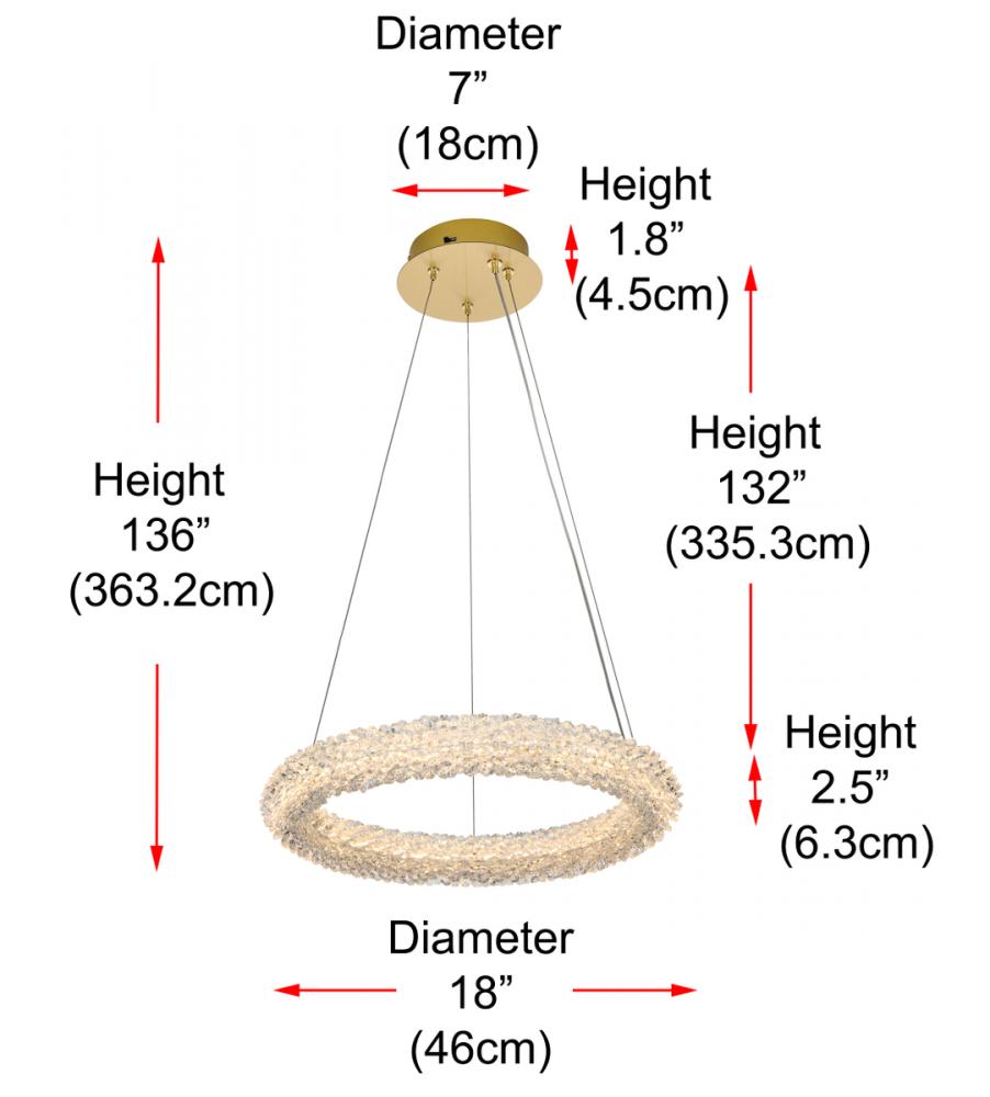Elevate your space with our 18-inch LED Chandelier, a perfect blend of chic design and sophistication. Customize your lighting with an adjustable height from 10 to 136 inches. Experience a hassle-free installation with no assembly required. Choose from three color temperatures (3000K, 4500K, 6000K) to set the perfect mood for any occasion. Crafted with durable Iron and Crystal materials, this chandelier promises long-lasting reliability. ETL listed for safety compliance, it ensures a secure and reliable lighting solution. Embrace hassle-free brilliance with integrated LED technology, eliminating the need to buy bulbs for enduring and maintenance-free illumination."