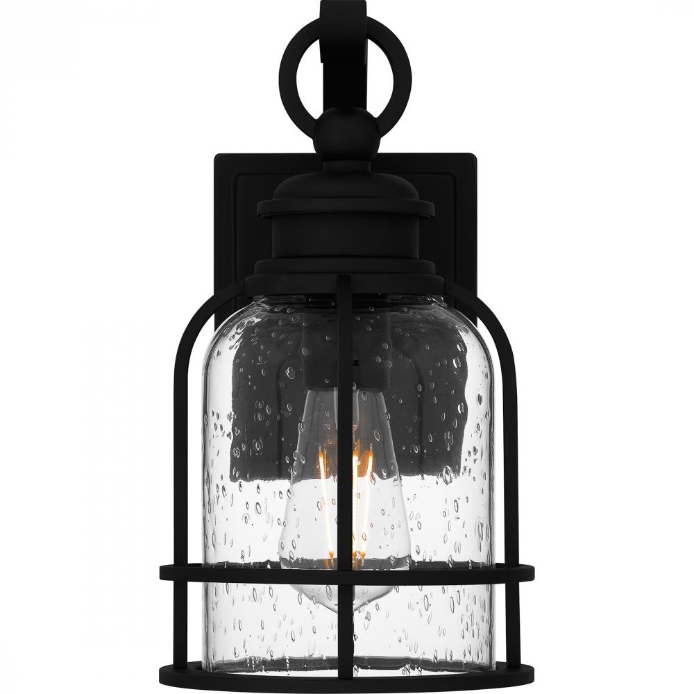 Bowles outdoor lanterns give a nod to both industrial and coastal design. The stately silhouette features clean lines, intricate hook detailing, and exposed bulb sockets - all in a classic Earth Black finish. Clear seedy glass completes the look, offering