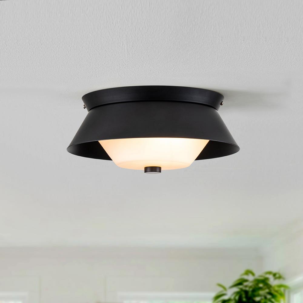 Bowtie Flush Mount in Matte Black. Bowtie is a chic and retro design. Light is diffused by a beautiful Opal glass shade.