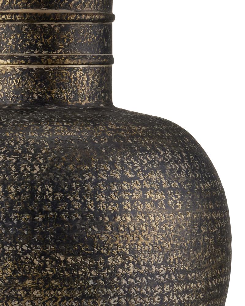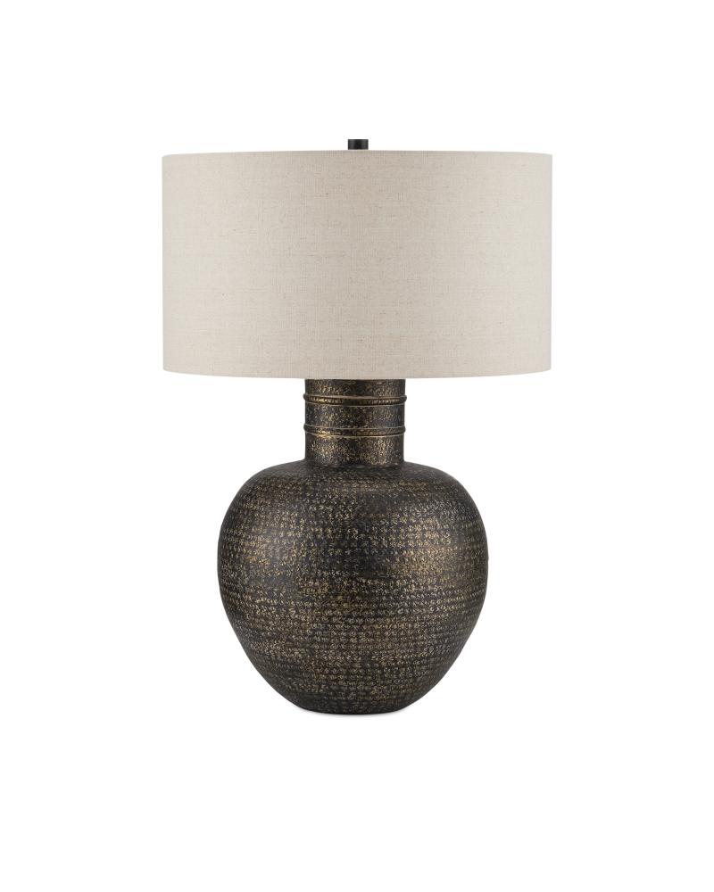When rustic patina is desired, the Braille Table Lamp will deliver! Made of aluminum, the vase-shaped body has drifts of light and dark tones from the hand-applied antique brass finish that gathers in crevices and is wiped away from the hammered dimples that run along its surface. The raised rings on the neck of the lamp are a refined detail on the body that rises to meet the natural linen shade.
