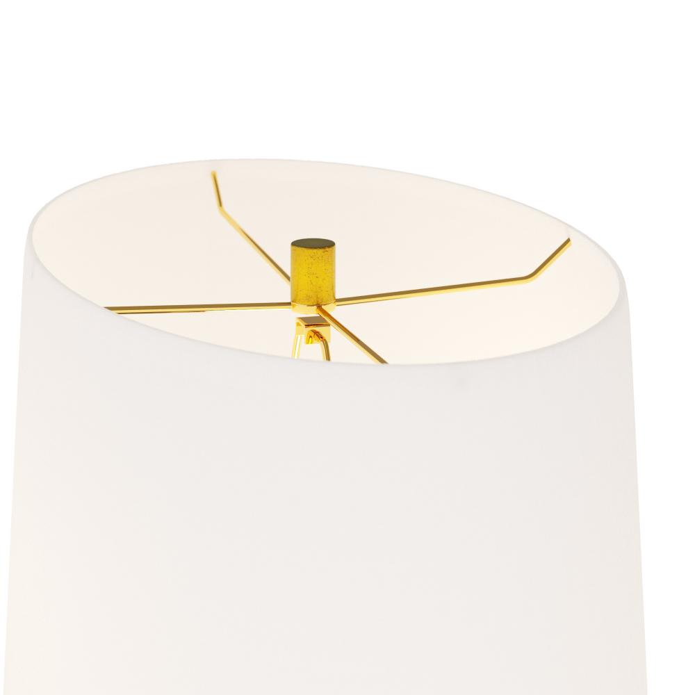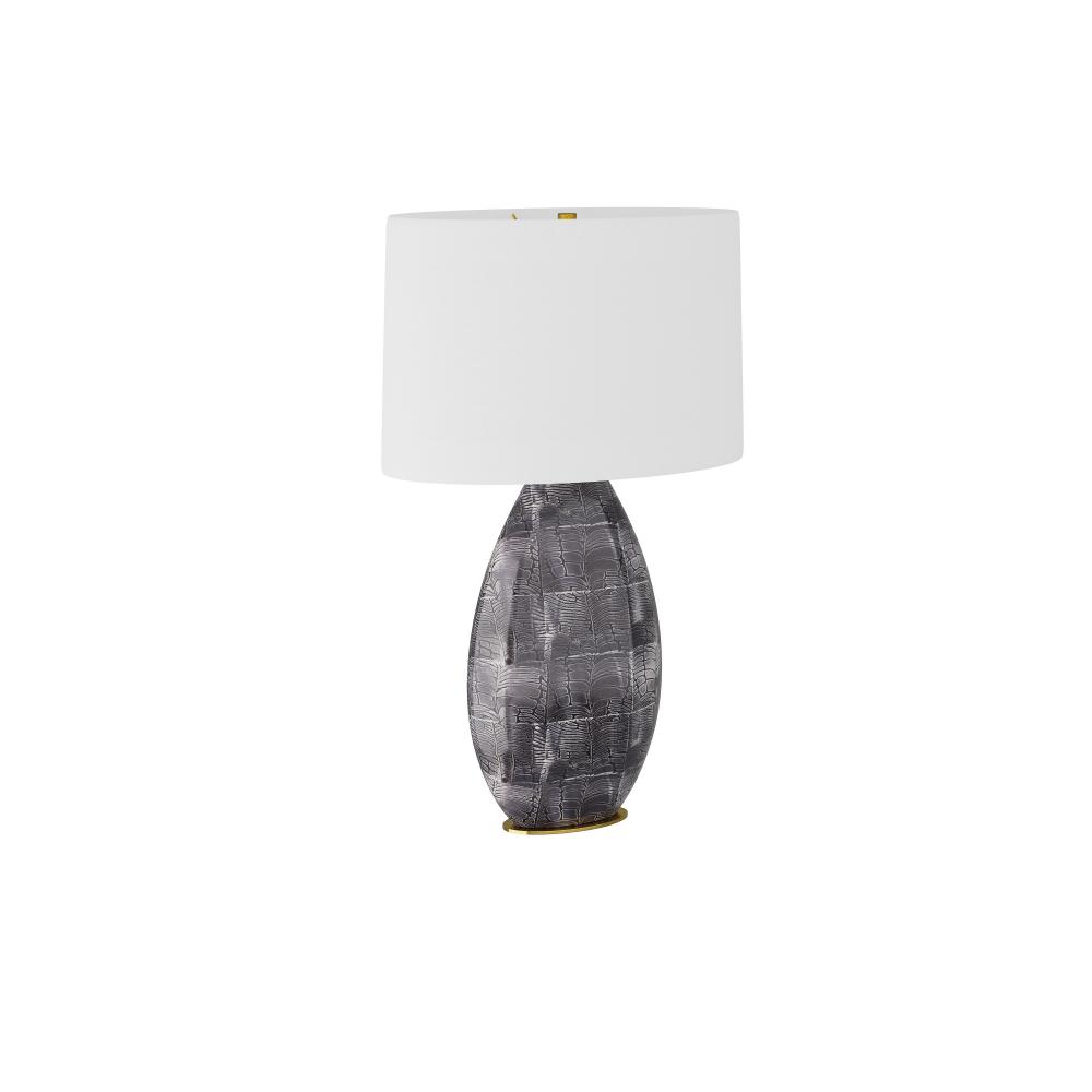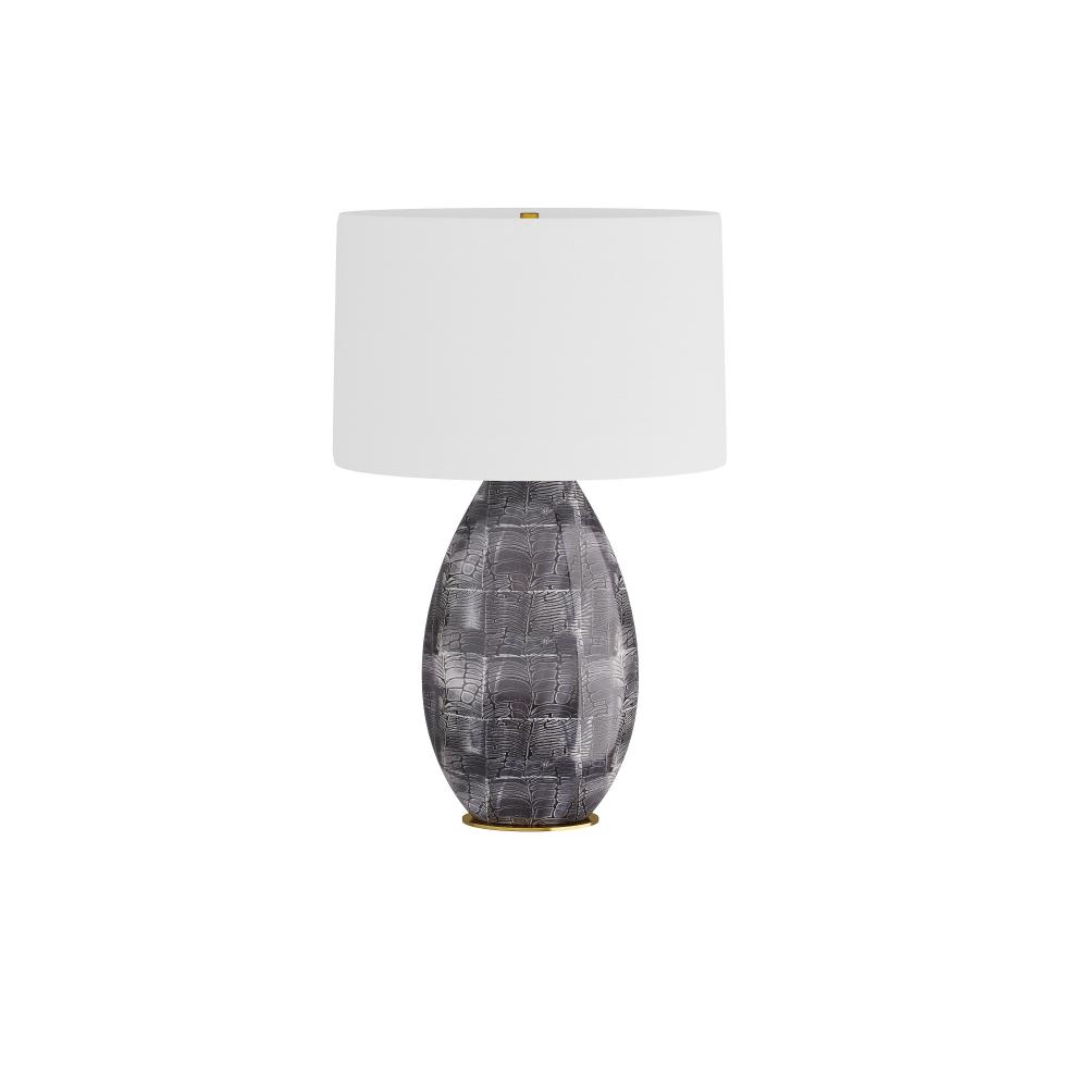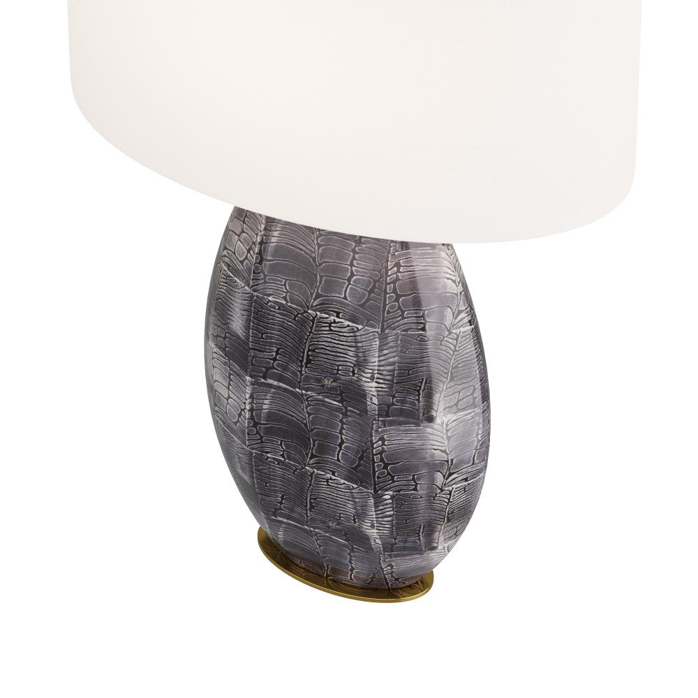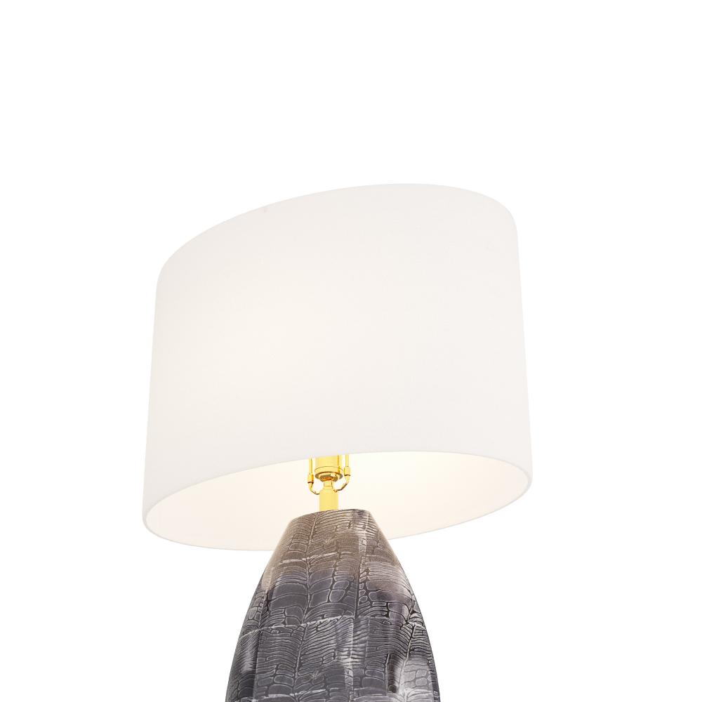 A simple porcelain form is glazed in a gray cobra finish to recall the iridescent scales of a reptile. Its form gently undulates to highlight an intriguing mix of gray, black, and white patterns atop an oval base of antique brass. An oval drum shade of white microfiber lined in cotton adds a neutral accent. Taupe cloth cord and three-way rotary switch.