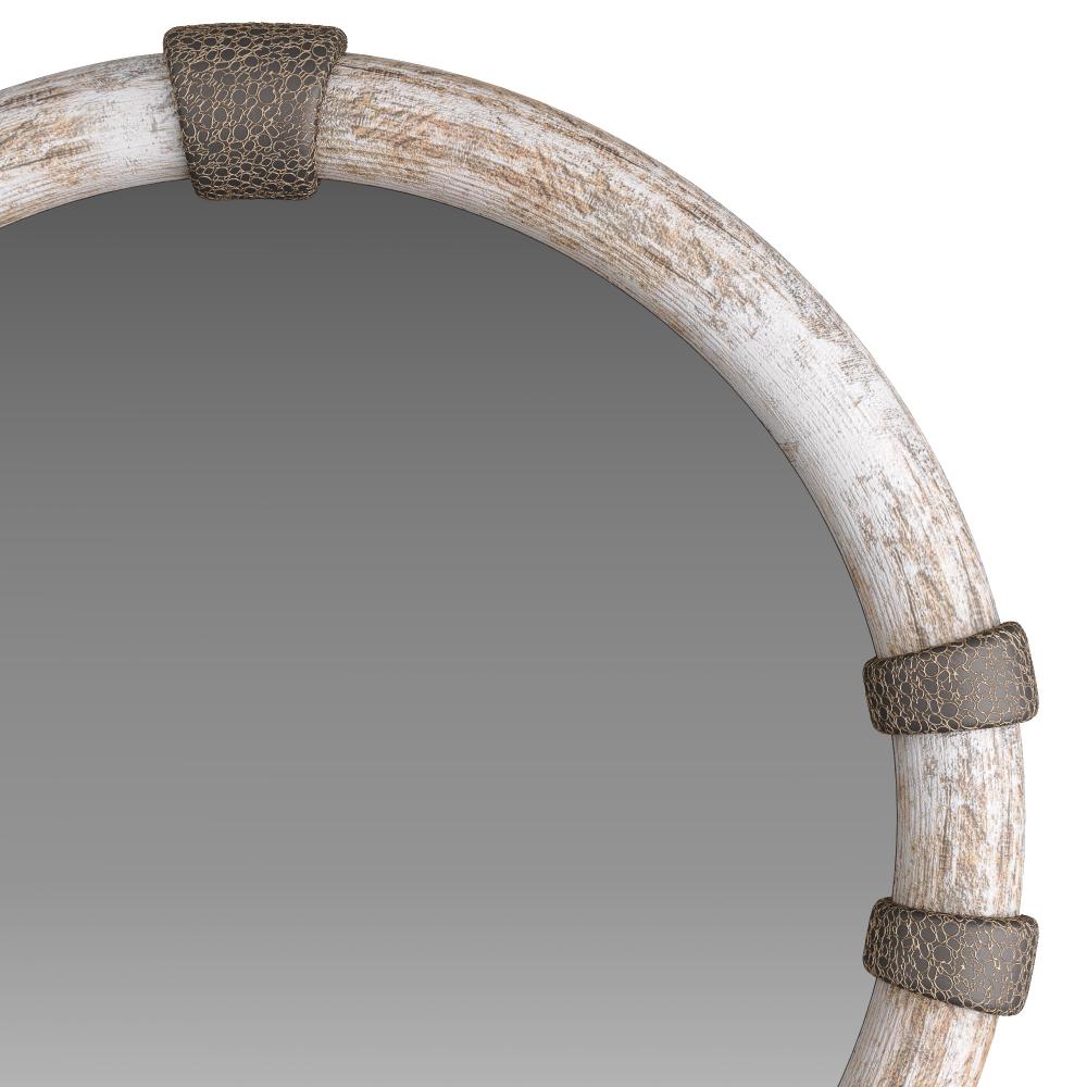A circular frame of lime-washed mango wood is punctuated with bands of bronzed brass in a style reminiscent of a diver’s watch. The perfect blend of organic and machined materials, this dramatic piece offers a mix of textures to draw the eye. Designed to be hung vertically, it is fitted with a security cleat. Finish will vary.