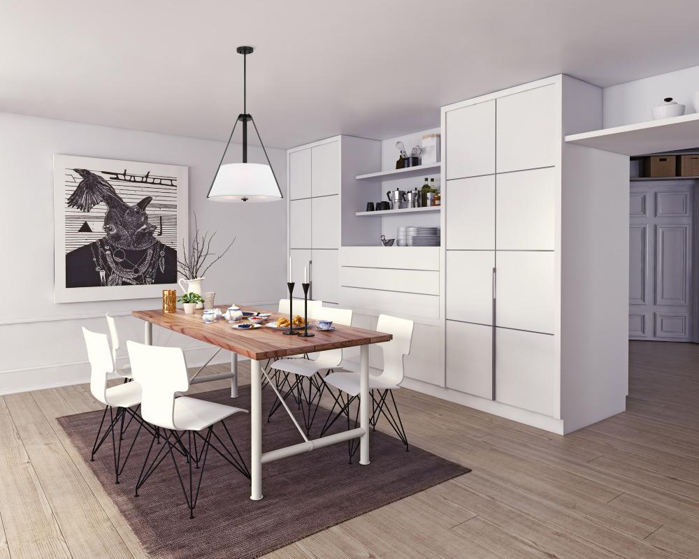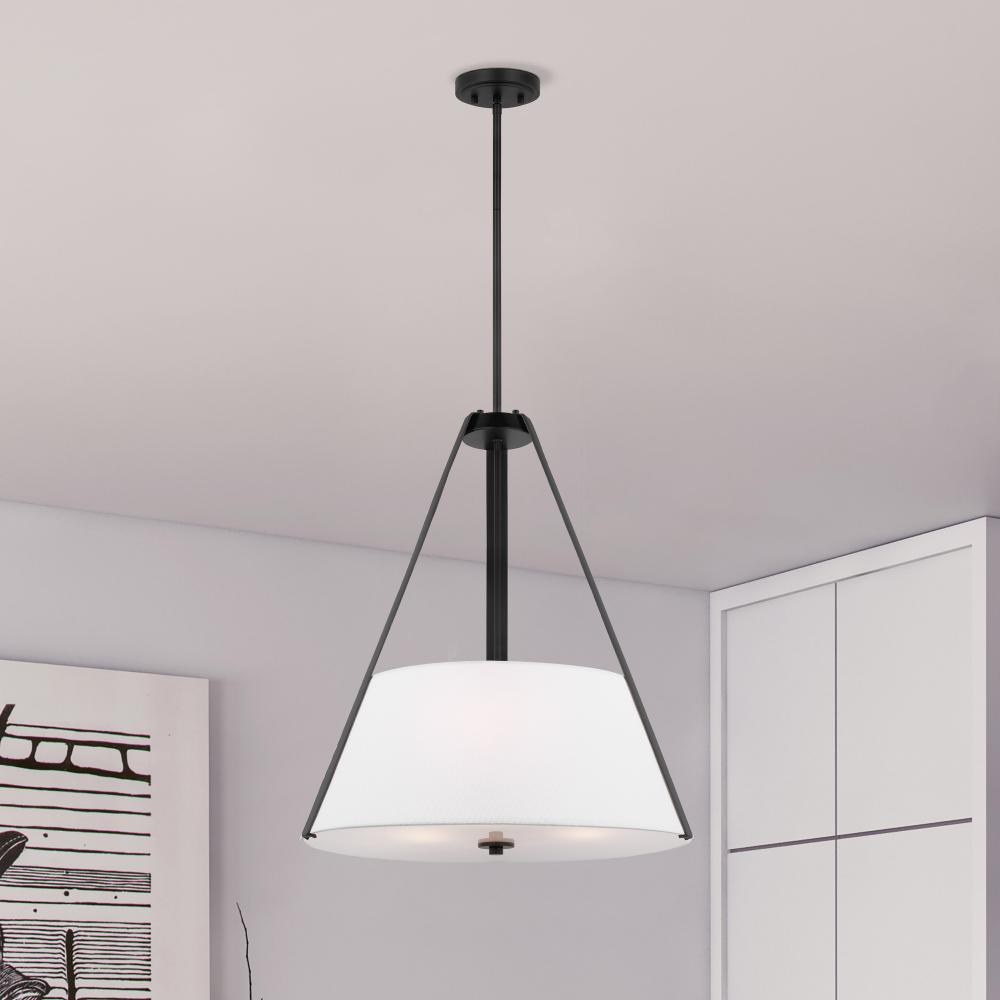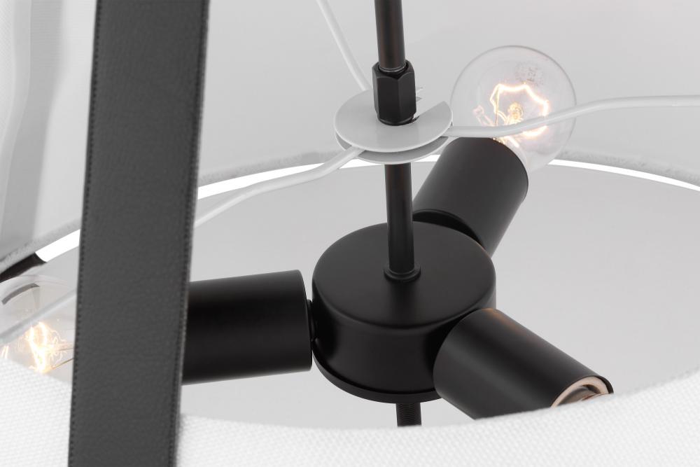 Simplicity of form, function and style comprises the Brewster pendants, with clean lines and an understated design. A large white fabric shade is suspended by the leather strap-inspired arms of the fixture body, and are finished in contrasting black. This