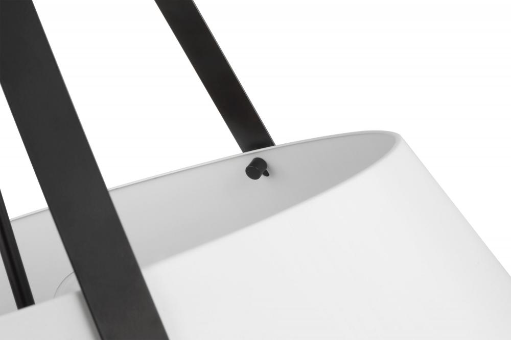Simplicity of form, function and style comprises the Brewster pendant, with clean lines and an understated design. A large white metal shade appears suspended by the metal strap arms of the fixture, finished in contrasting black. This pendant is perfect fo
