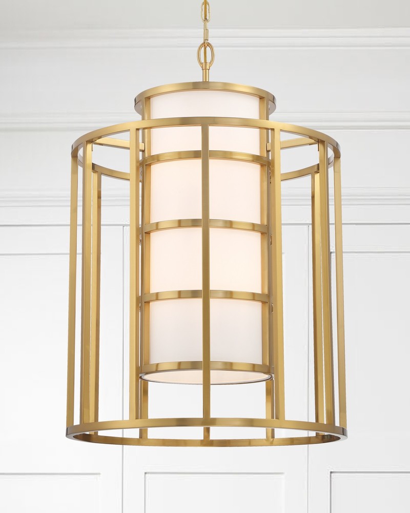 Bring style and substance to your favorite indoor space with Brian Patrick Flynn's Hulton Collection. Inspired by the shape and scale of classic drum chandeliers, the Hulton Collection adds a unique geometric twist to the category by incorporating a shade-less metal drum form around the perimeter of the inner white silk drum shade. With its strong sculptural qualities and bold graphic lines, the Hulton Collection is the perfect statement piece for any room.