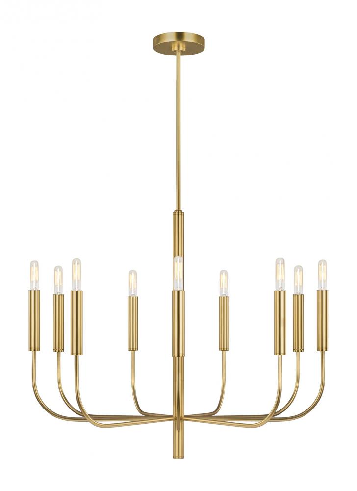The Brianna nine light single tier chandelier in burnished brass provides abundant light to your home, while adding style and interest. Brianna's graceful, seamless curvature and elongated tubular arms lend fluidity and modern appeal to this classic minimalist silhouette. Available in rich, gilded Burnished Brass and the more contemporary Polished Nickel finish. Brianna wall sconces include cylindrical shades in fresh White Linen.