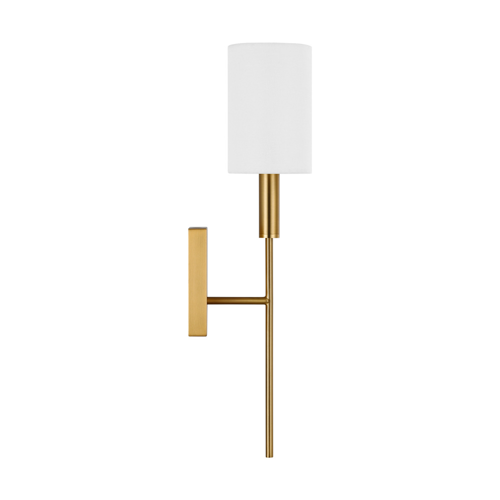 The Brianna one light wall sconce by Ellen DeGeneres in Burnished Brass offers shadow-free lighting in your powder room, spa, or master bath room. Brianna's graceful, seamless curvature and elongated tubular arms lend fluidity and modern appeal to this classic minimalist silhouette. Available in rich Aged Iron, Burnished Brass and Polished Nickel finish. Brianna wall sconces include cylindrical shades in fresh White Linen. We are expanding this top selling series by Ellen DeGeneres to include a tail sconce in three finishes.