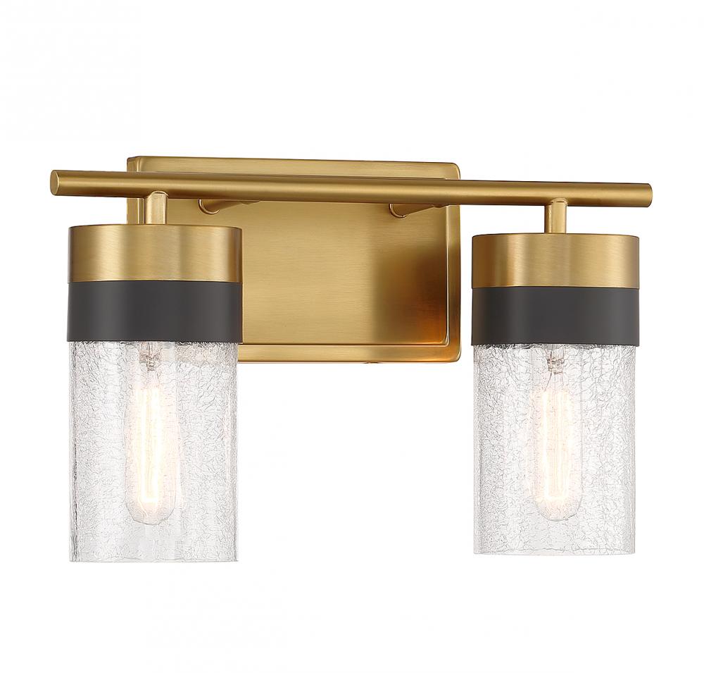From top to bottom, the Savoy House Brickell 2-light bath vanity light is designed to make any bathroom a standout space. Its classic pairing of warm brass and black is made even better with the addition of textural clear crackled glass shades. Brickell is 8.75" in height, 14" in width and extends 5" from the wall. It uses 2 standard size bulbs of up to 60 watts per bulb (bulbs not included).