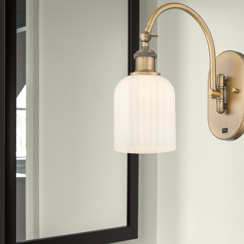 Bridal Veil - 1 Light - 5 inch - Brushed Brass - Gloss White Shade - Adjustable Swing Arm