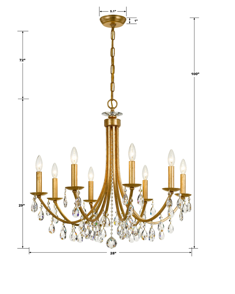 A classic yet moderns style with slim, upward curved arms strung in curtains of faceted crystal jewels, create visual interest. Complementary to a variety of home décor styles this chandelier will work in any space.