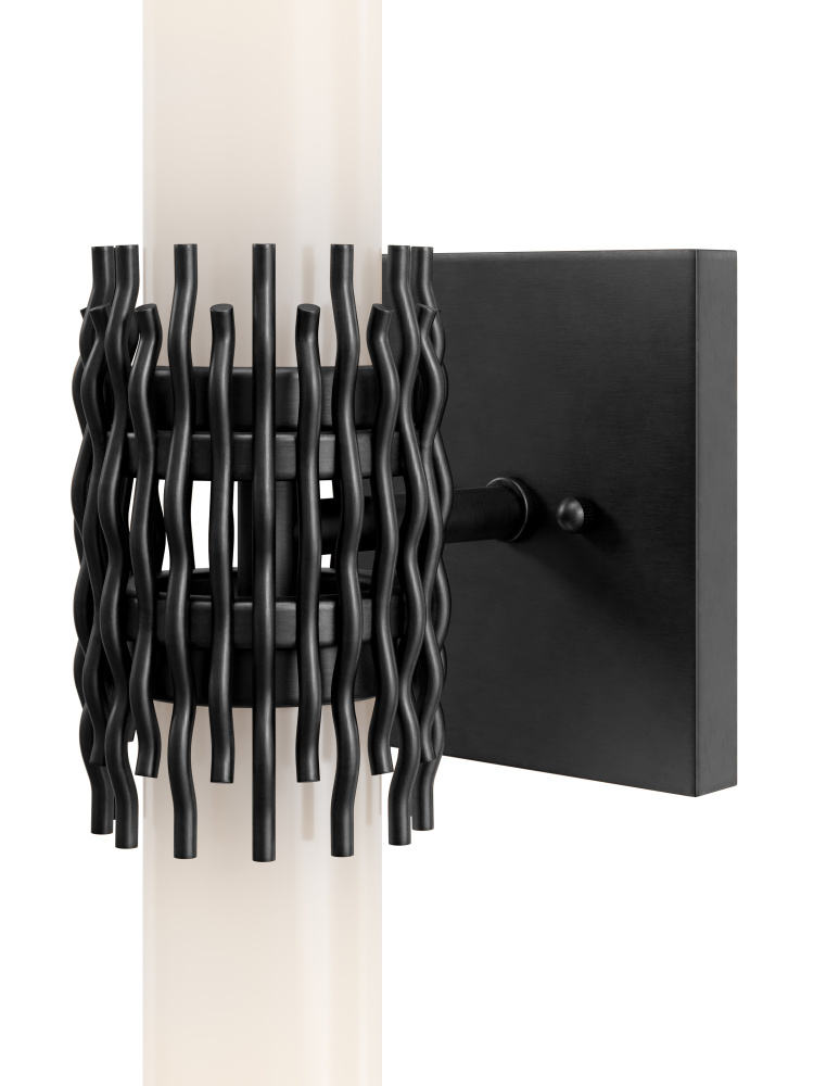 The Brietta Bronze Bath Wall Sconce, which is made of metal in an oil-rubbed bronze finish, is a study in textural movement and smooth stillness. The way the two milky glass tubes are designed to sit within the undulant wires is a sophisticated design detail, as they leave an open negative space in the middle. The black sconce, which is fitted with two bulbs that are elongated to fully light the tubes, is 23 inches tall, damp rated, and dimmable.