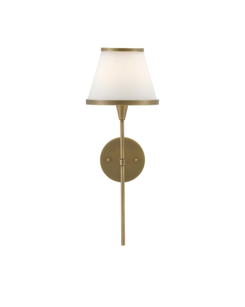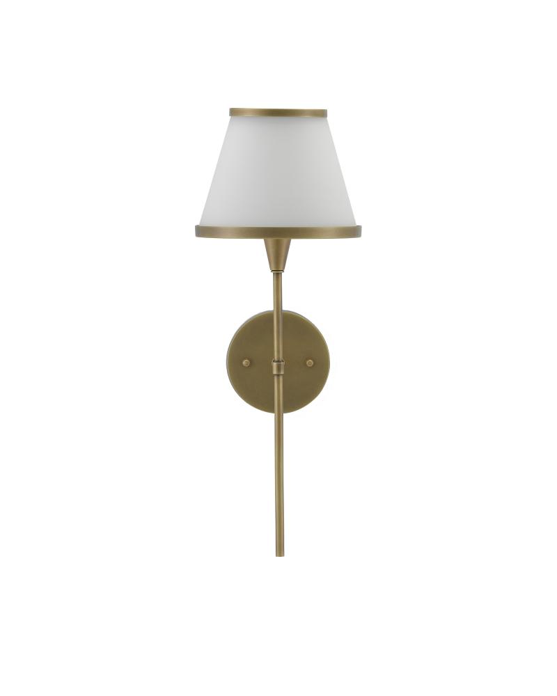 Pencil thin with a stylish trim on its opaque glass shade, the Brimsley Brass Wall Sconce is brimming with tailored sophistication. The gold wall sconce is made of metal in an antique brass finish, the warmth of the antiqued surfaces contrasting the crisp white glass on the shade. The Brimsley is also available in polished nickel and oil-rubbed bronze finishes, all three sconces certified for damp locations. Part of the Bagno Collection of wall sconces designed for bathroom spaces.