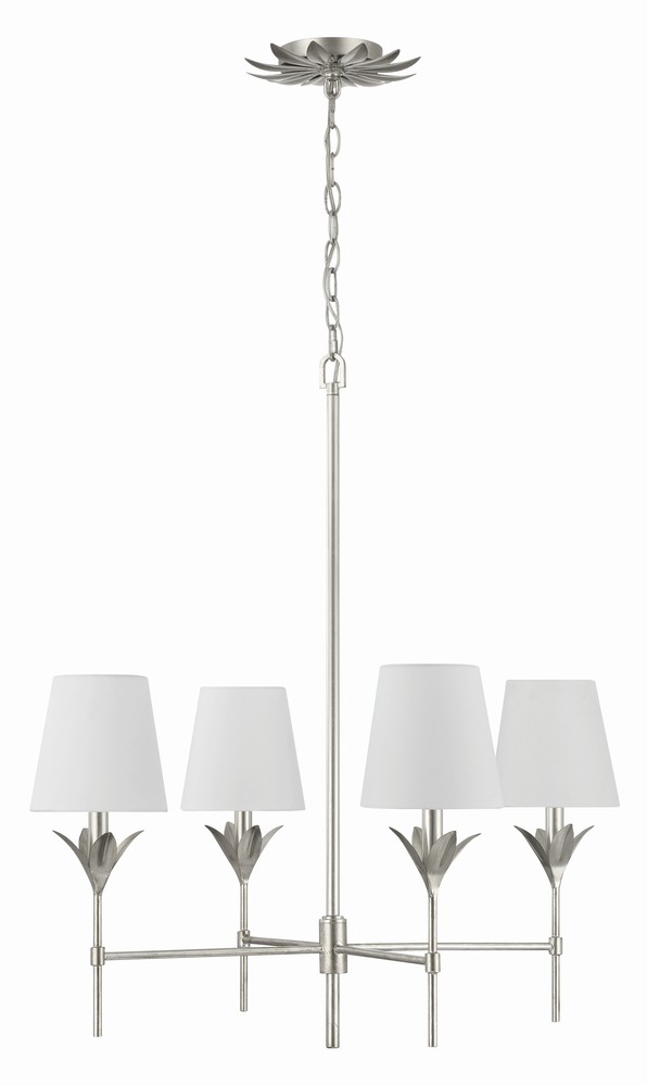 The Broche 4 Light Chandelier embodies a harmonious blend of traditional and modern elements. This fixture exudes timeless elegance with its candelabra-style frame and white linen shades. The layered wrought iron leaves create a stunning and functional display of light. Whether in a bedroom, living area, or kitchen, this chandelier adds a touch of refined glamour to any space, making it perfect for transitional and modern designs.