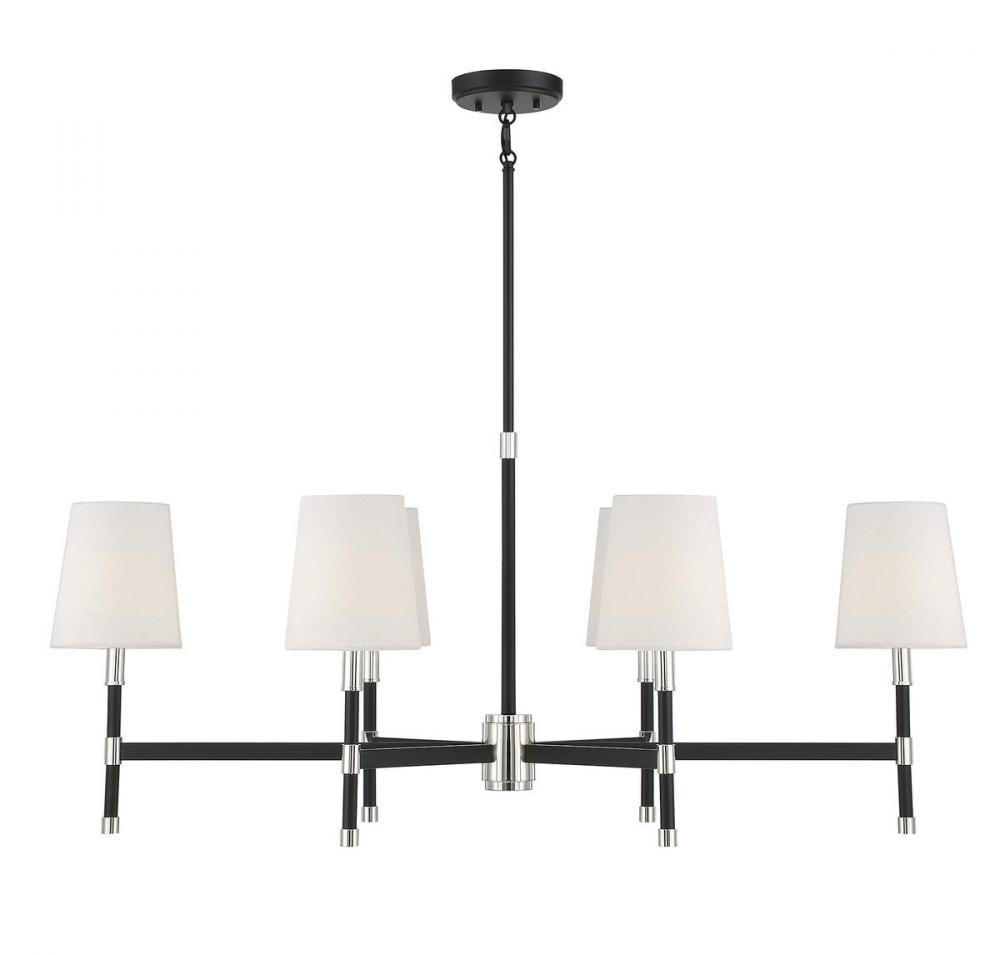 The Savoy House Brody 6-light linear chandelier is a great way to infuse your home with sophisticated lighting style. Its streamlined classic look is decorated with white fabric shades and finished in matte black with shining polished nickel accents. It's perfect for brightening up any room! Brody is 41" in length and 18" in width. It has an adjustable height ranging from 24" to 70". It uses six candelabra size bulbs with a max of 60 watts per bulb. Comes with four 12" downrods and one 6" downrod, plus 80" of cord.