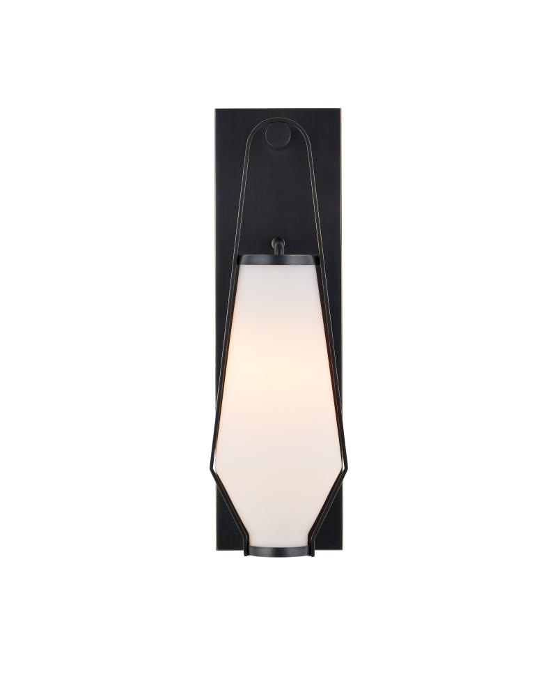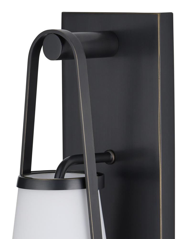 The Brompton Bronze Bath Wall Sconce dangles its shade like it is balancing a canister filled with illumination. Designed with a slim, rectangular wall-plate made of wrought iron in an oil-rubbed bronze finish, the knob from which the shade hangs and the handle that cradles it are also in metal in the same finish. The opacity of the beautifully shaped shade on the black wall sconce creates a luminous glow.
