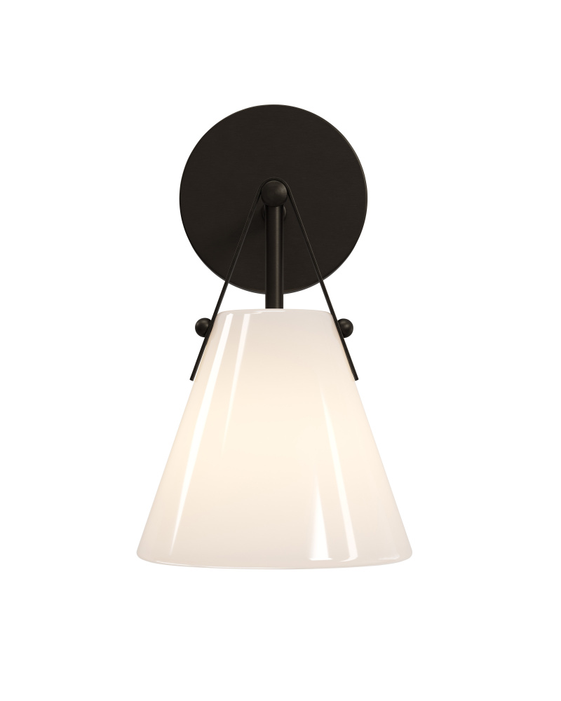 The Bronwen Bronze Bath Wall Sconce is an equestrian-inspired design with a flaring white glass shade fastened to the round wallplate with a sophisticated strap—a subtle nod to classic tack hardware. It can lean modern farmhouse, though it also complements other design styles. The metal in an oil-rubbed bronze finish is a nice contrast to the paleness of the shade, which has a glossy surface that glows. At nearly 12 inches tall, the one-light sconce is damp rated and dimmable.