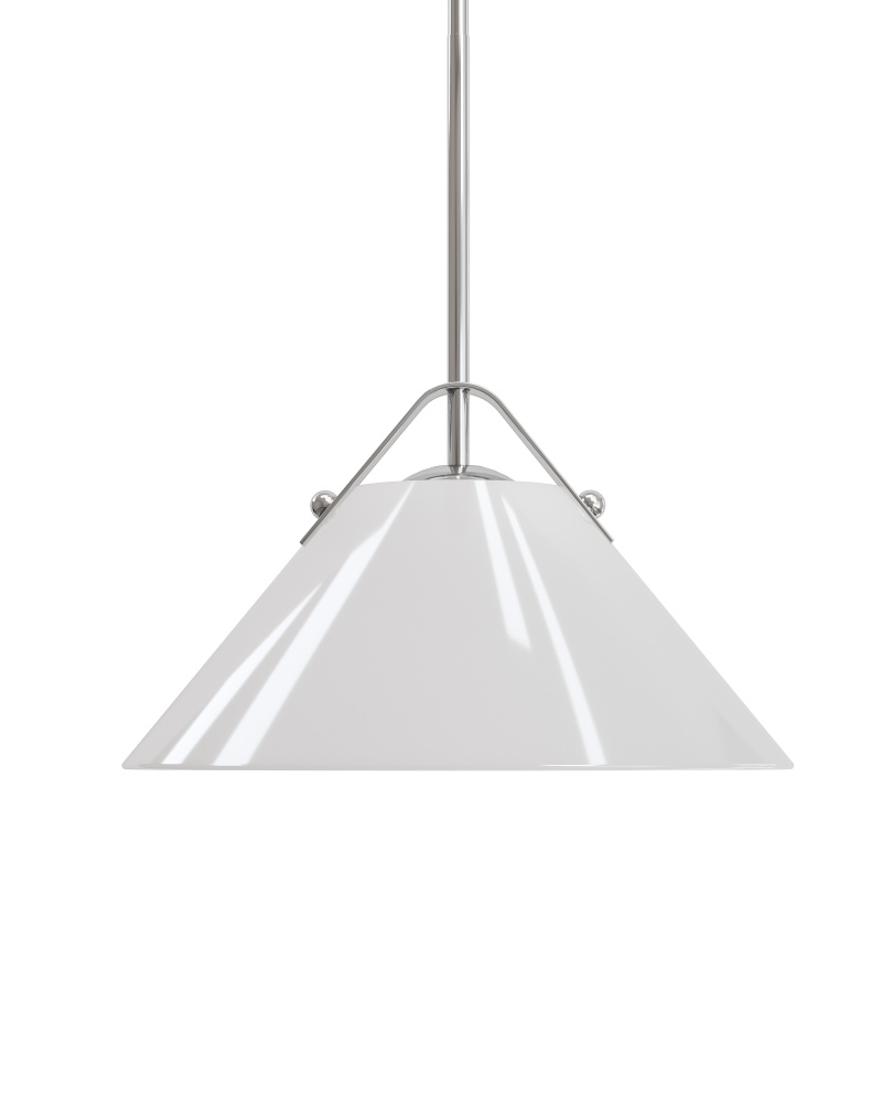The Bronwen Nickel Pendant is an equestrian-inspired design with a flaring white glass shade fastened to the round canopy with a sophisticated strap—a subtle nod to classic tack hardware. The profile can lean modern farmhouse, though it also complements other design styles. The metal in a polished nickel finish is complements the paleness of the shade, which has a glossy surface that glows. At 19 inches in diameter, the one-light pendant is dimmable. Adjustable from 18" to 60" with use of included chain/rod kit/cable. If your space calls for a longer drop, additional chain/rods/cable is available for purchase.