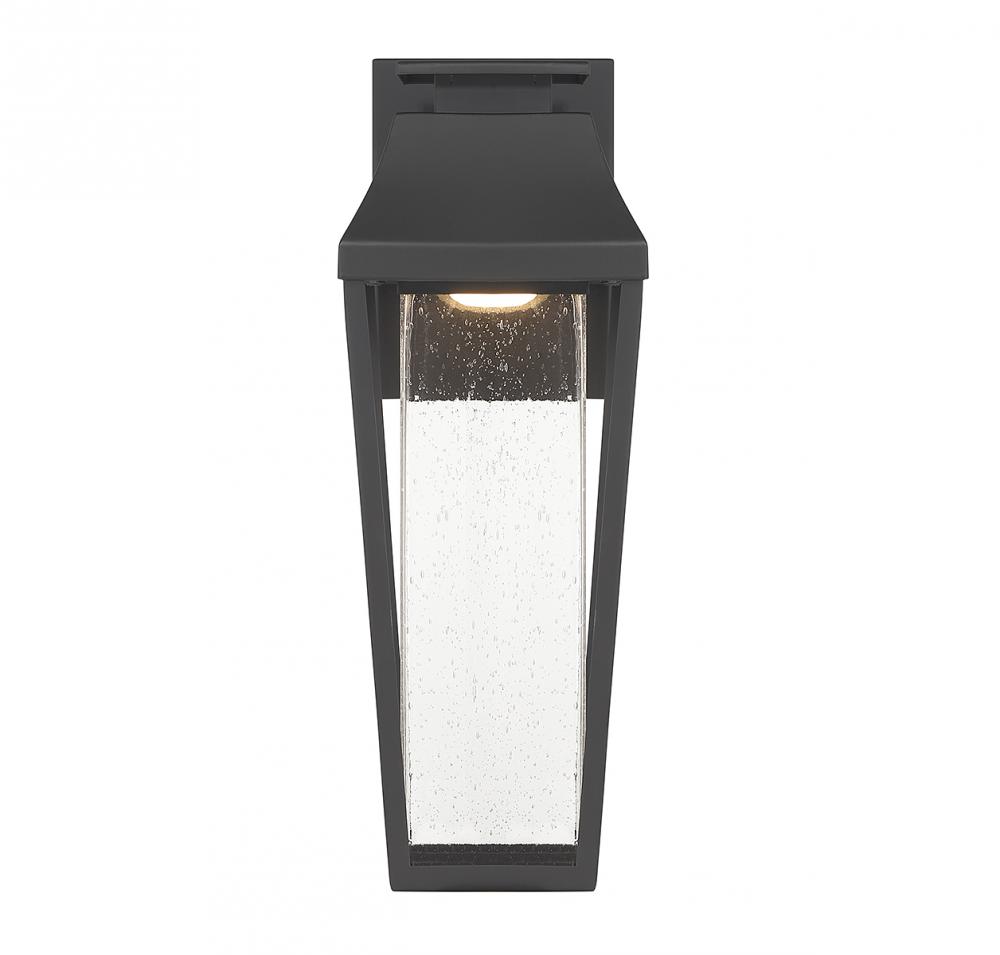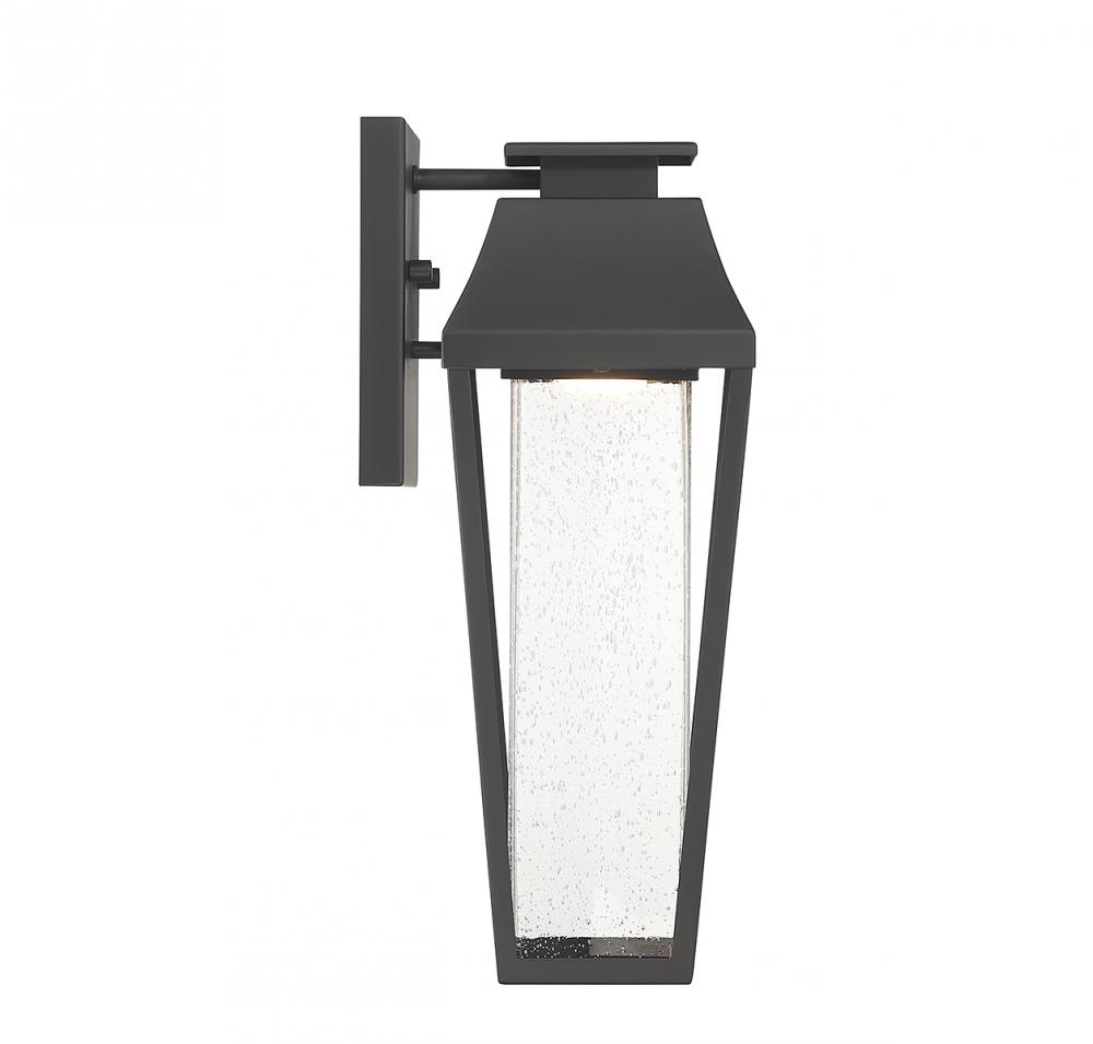 From Savoy House, the Brookline 1-light outdoor wall light showcases a more contemporary take on classic lantern-style illumination with a central column of clear seeded glass illuminated by integrated LED light. The matte black finish adds versatility. Brookline is 15" in height, 5.5" in width and extends 6.75" from the wall.