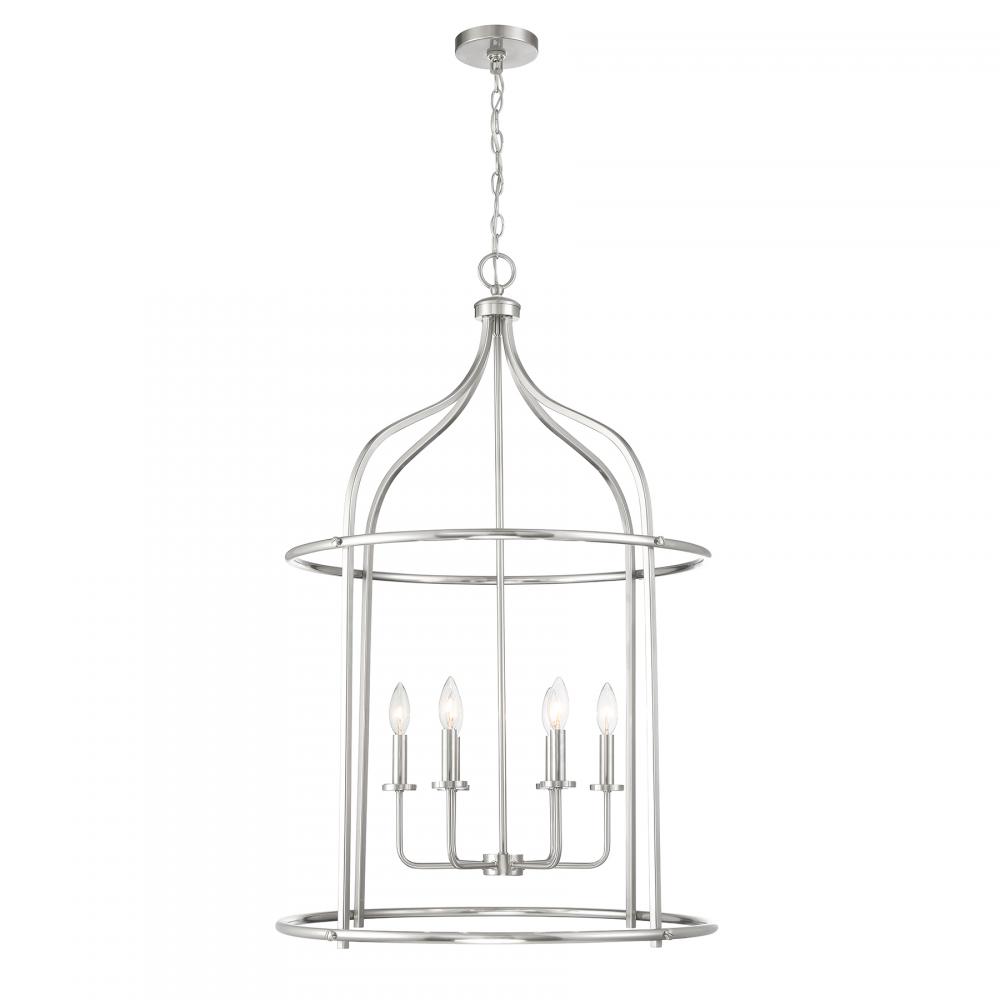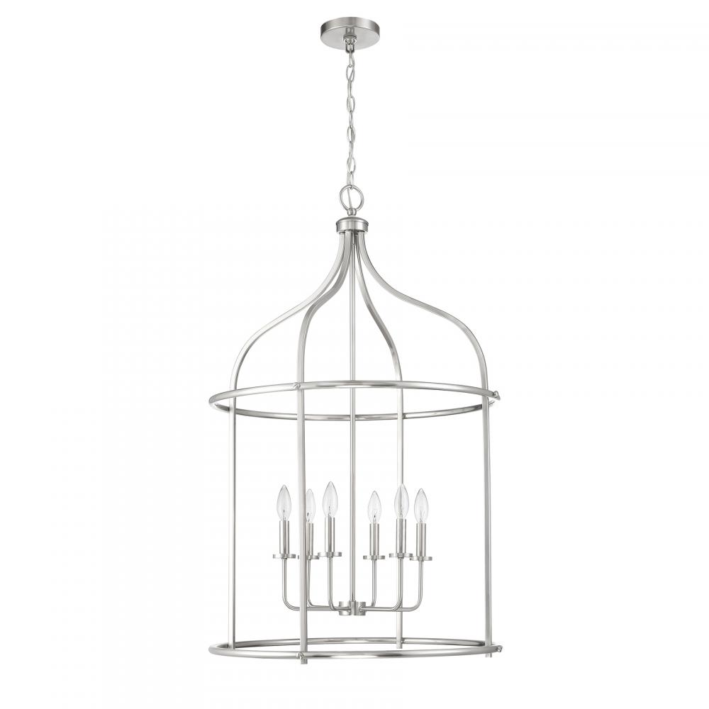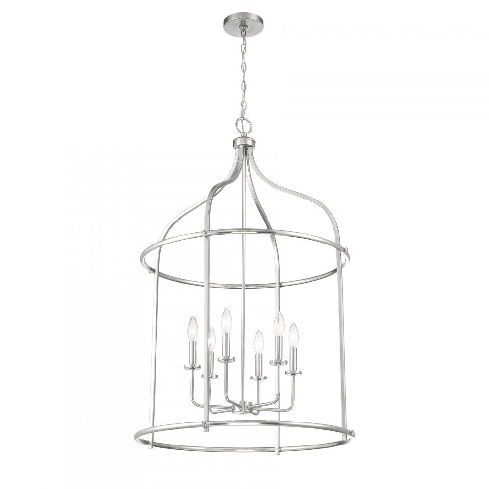 Brighten up boldly with the Savoy House Brookstone 6-light lantern. It has a simply elegant open lantern style and a sleek Satin Nickel finish. At 40" in height and 26" in width, it is a great way to illuminate a large room, like a grand foyer. Brookstone uses six candelabra size bulbs of up to 60 watts per bulb. Bulbs not included.