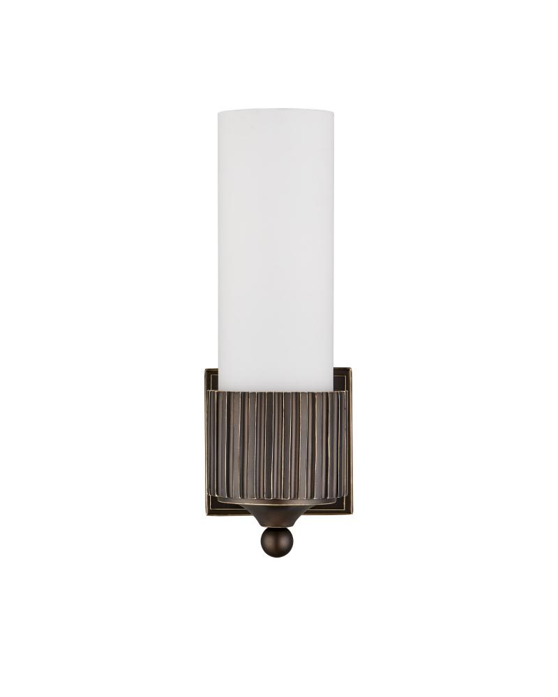 The Bryce Black Bath Wall Sconce is a clean-lined fixture that will be at home in any number of styles. This simple round form is embellished with a motif that hearkens to industrial gears. Its designer Barry Goralnick is adept at exploring these forms to which an oil-rubbed bronze finish brings a handsome touch. The classically inspired finial that ornaments the bottom of the sconce is a sophisticated focal point, and the frosted glass tube provides an even glow.