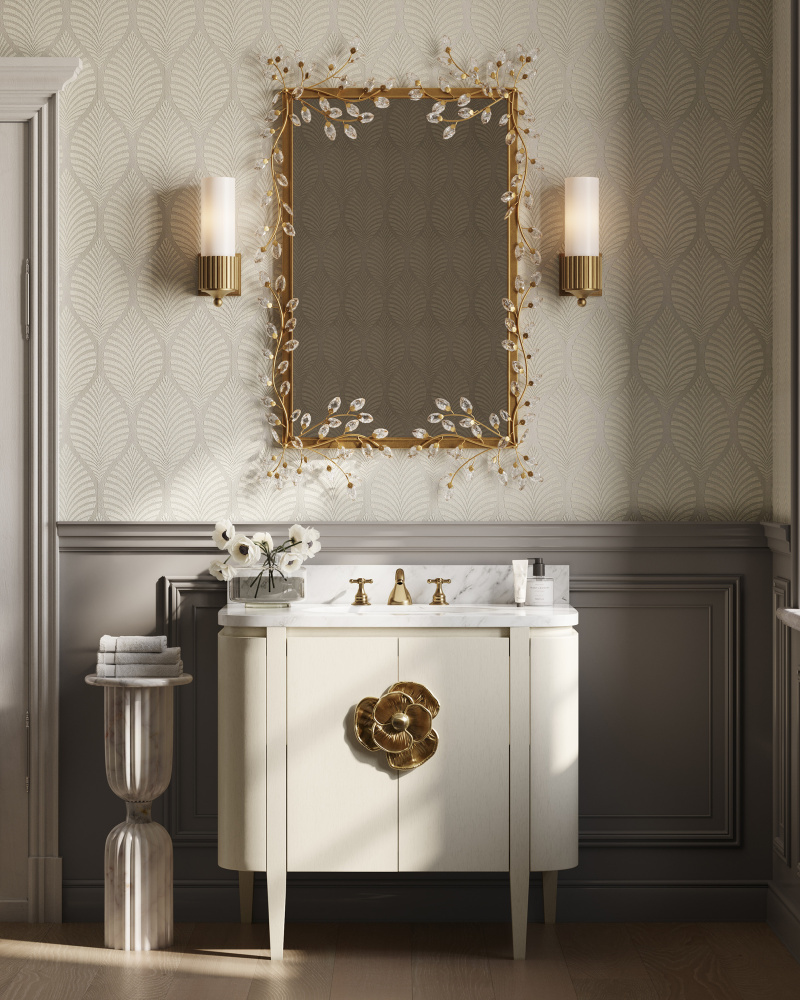 The Bryce Gold Bath Wall Sconce is a clean-lined fixture that will be at home in any number of styles. This simple round form is embellished with a motif that hearkens to industrial gears. Its designer Barry Goralnick is adept at exploring these forms to which a gold finish brings a luminous touch. The classically inspired finial that ornaments the bottom of the sconce is a sophisticated focal point, and the frosted glass tube provides an even glow.