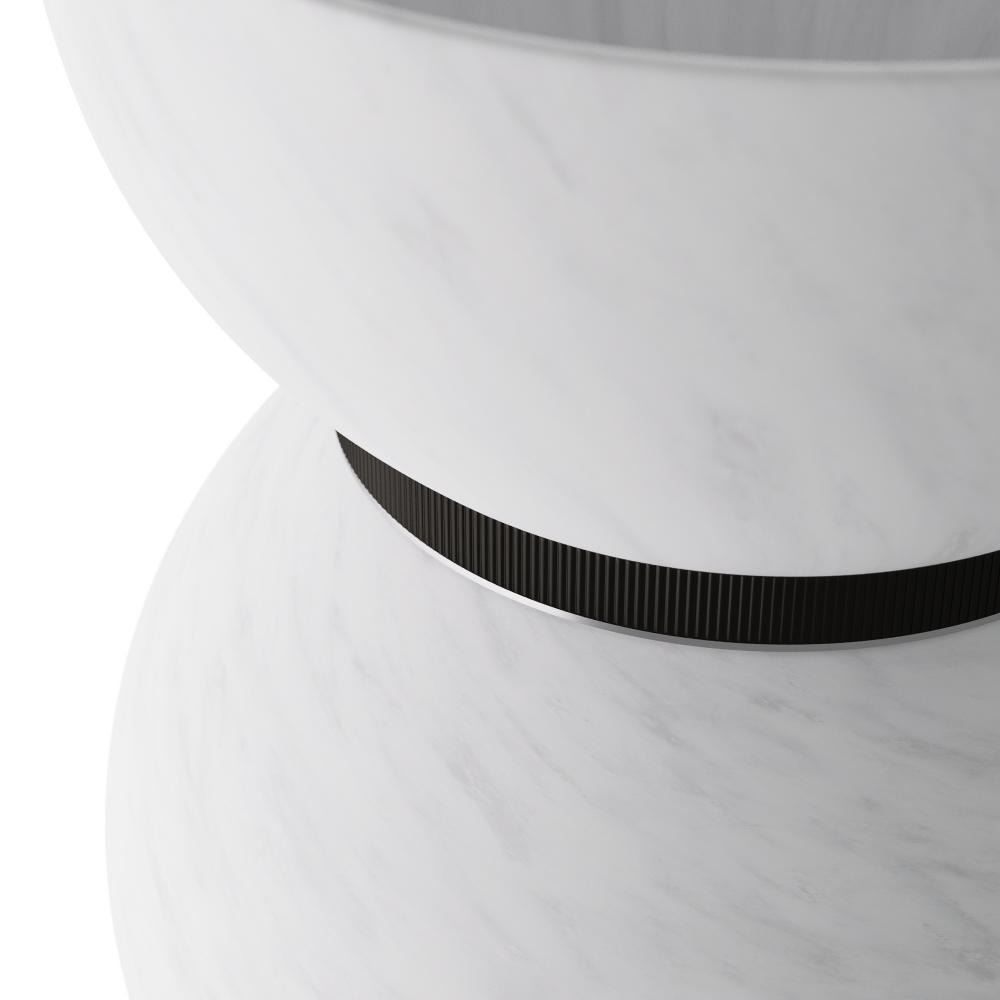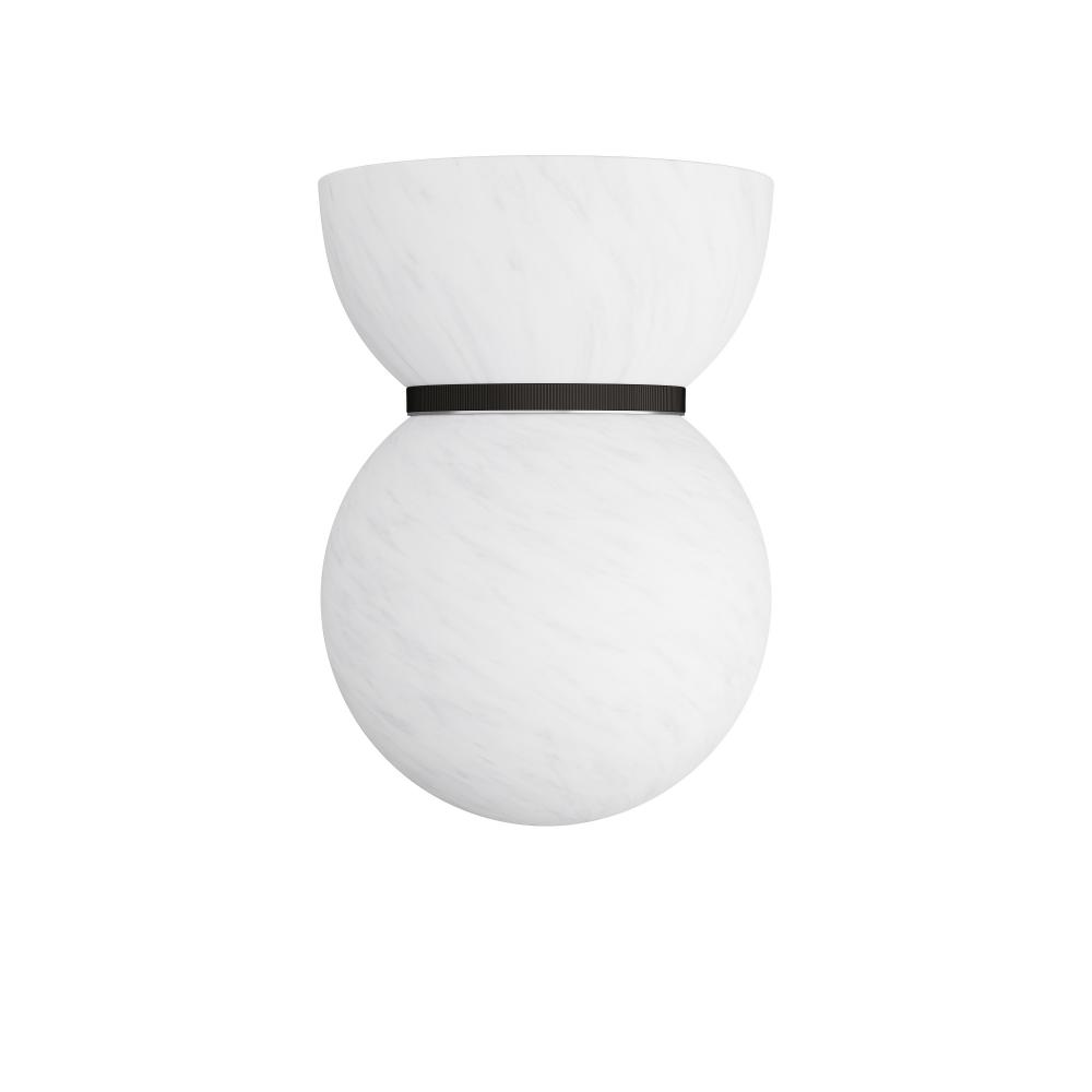 Matte swirl glass lends a lively effect to our spherical flush mount. Anchored by a tapered mount with an English bronze steel band accent, it resembles nothing so much as an upside-down snow globe. Damp-rated, although limited covered outdoor conditions may affect finish. Finish will vary.