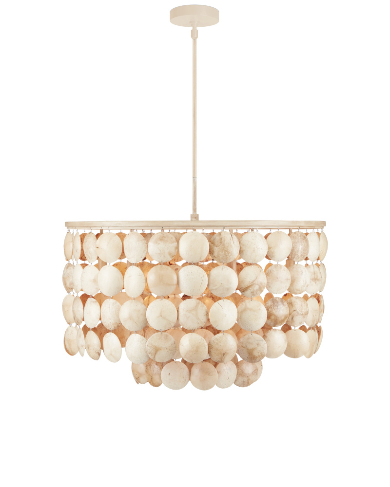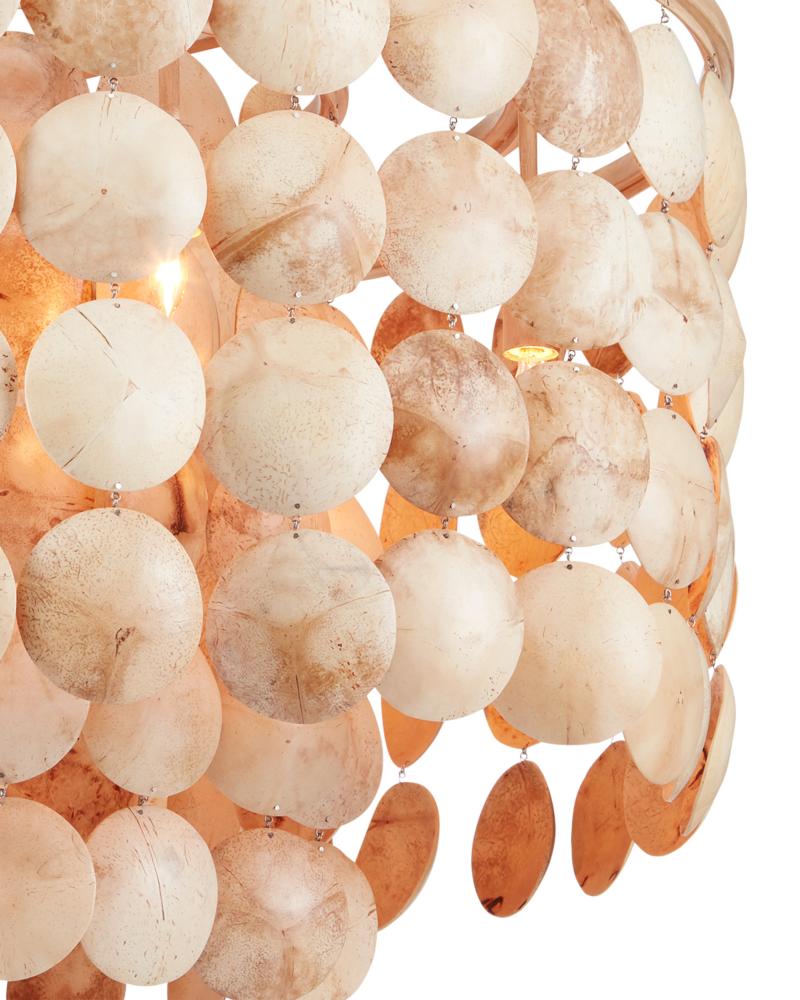 Exploring the shapes that could be achieved with coconut shells inspired the Buko Chandelier. The bulbs on the interior reflect warm light against the cool tone of the bleached coconut shells. This beautiful natural material also highlights the slight texture and imperfections in each shell disc. The chain and hardware on the round chandelier are in a Coco Cream finish. Adjustable from 27" to 71" with use of included chain/rod kit/cable. If your space calls for a longer drop, additional chain/rods/cable is available for purchase.