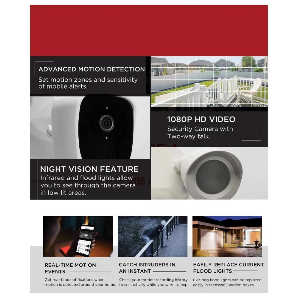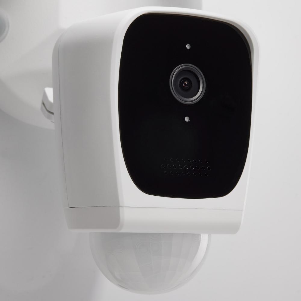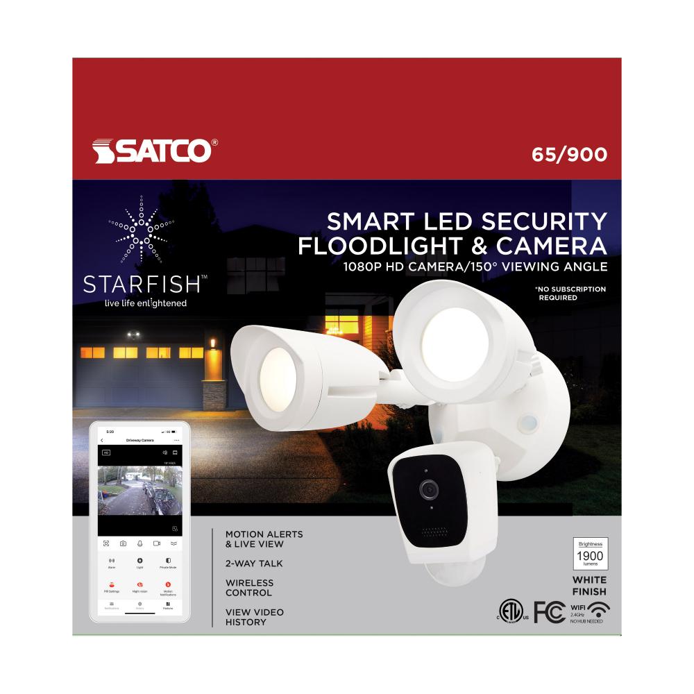 Stay connected and feel protected with Satco's new 65-900 20W white finish LED security floodlight. Featuring a 1080p HD camera with a 150 degree viewing angle, two-way talk, infrared night detection and advanced motion detection settings, you can rest