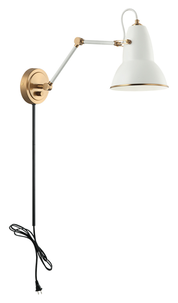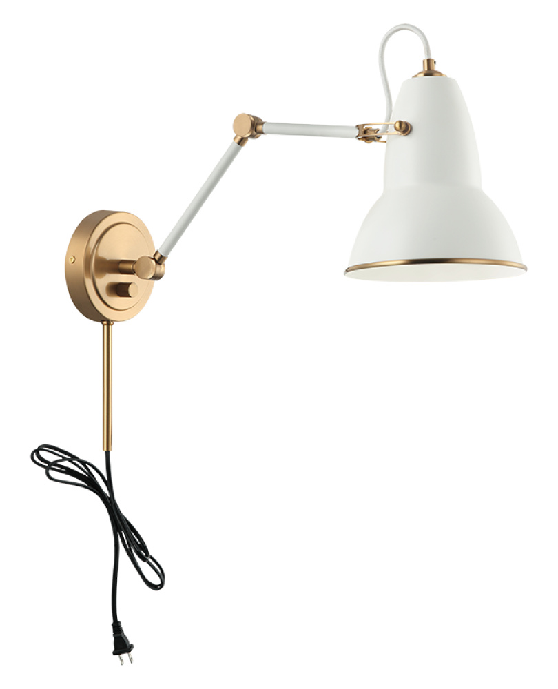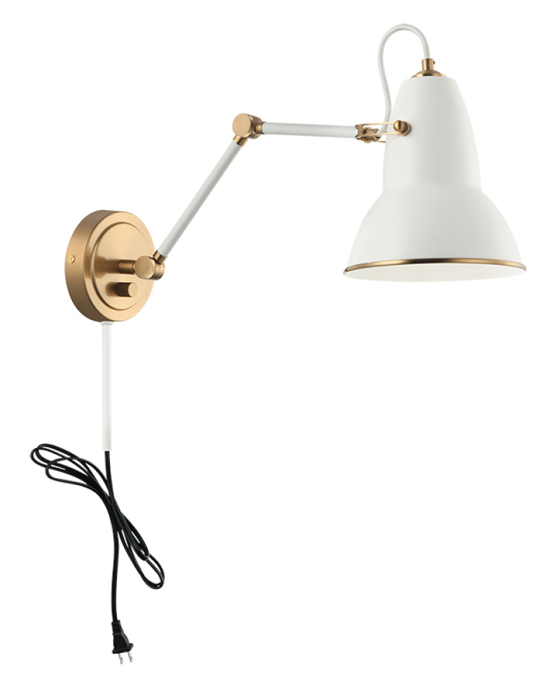 A playful yet sophisticated wall sconce collection. Designed with a dome shaped adjustable shade with Aged Gold Brass trim. This is extended with an adjustable arm. Features a built in dimmer, and available in 2 finish combinations and 2 sizes.