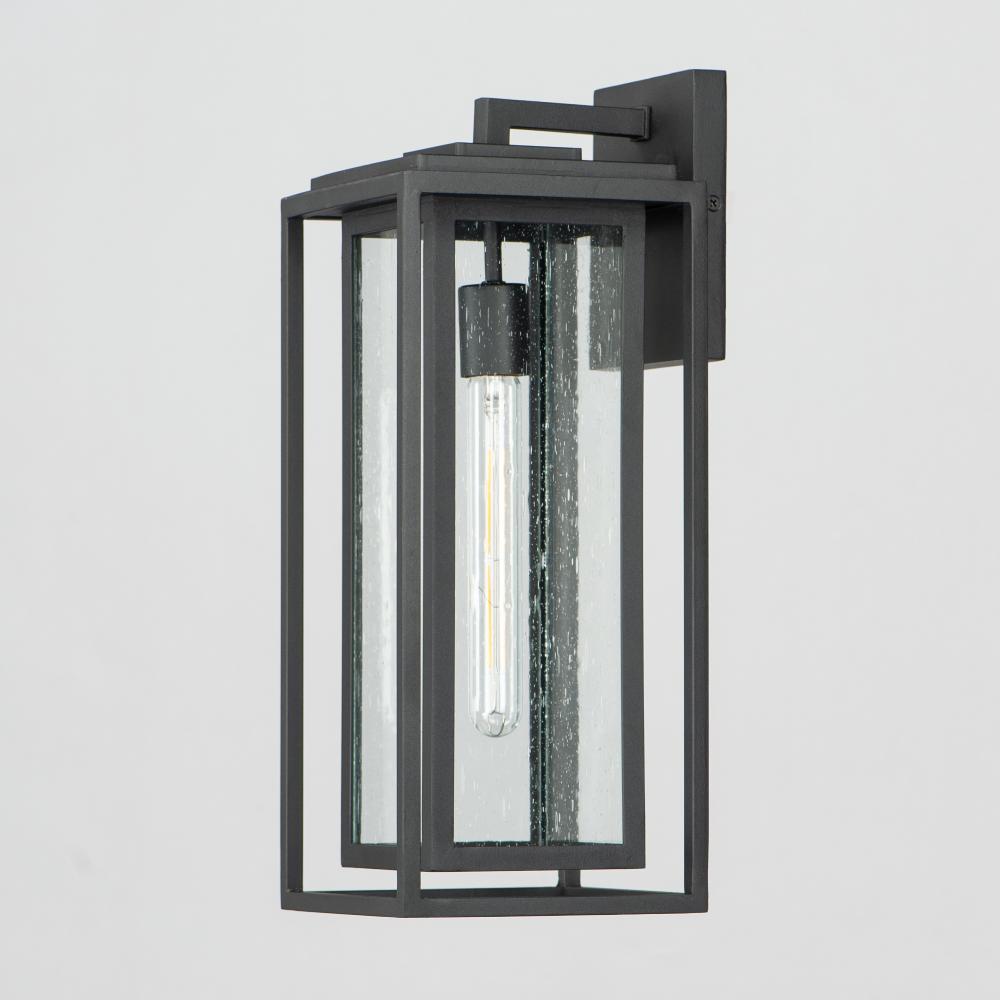 A dual framed structure creates dimension on these outdoor lighting fixtures that is both contemporary and transitional. The construction consists of two frames of square tubing and squared components. The inner frame's Clear Seedy glass reduces gla
