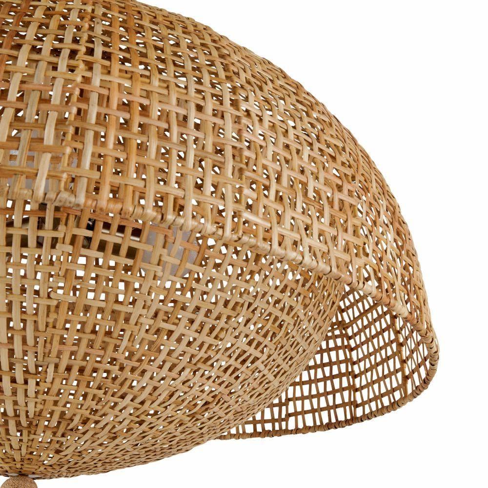 Clean, overlapping forms of natural rattan form a double-shaded pendant that is more than the sum of its parts. Accented with a playful tassel detail, this fixture suspends from a chain of antique brass-plated iron secured to an antique brass canopy that mirrors the rounded forms of the shades. Additional chain available. Finish will vary.