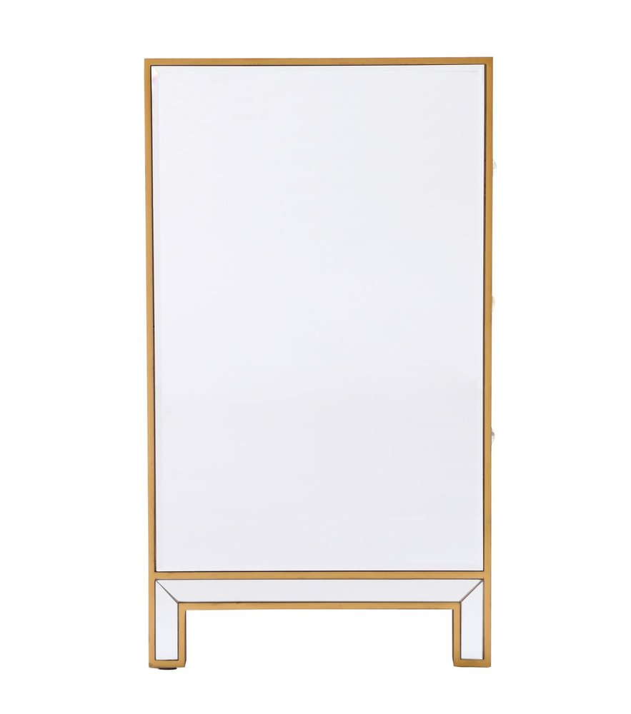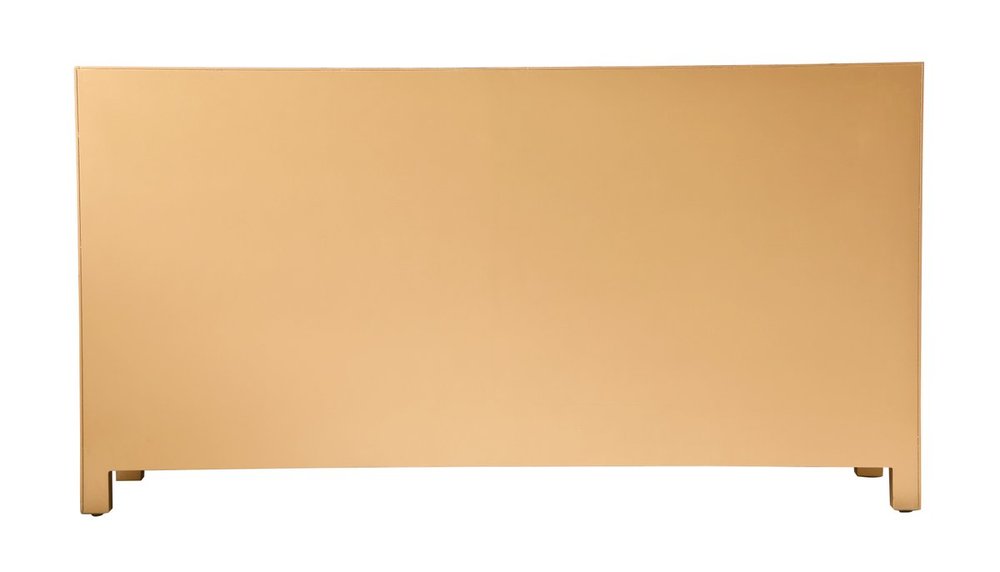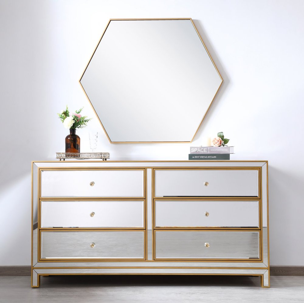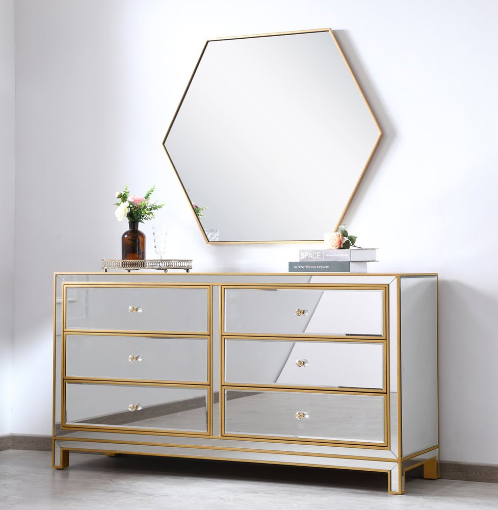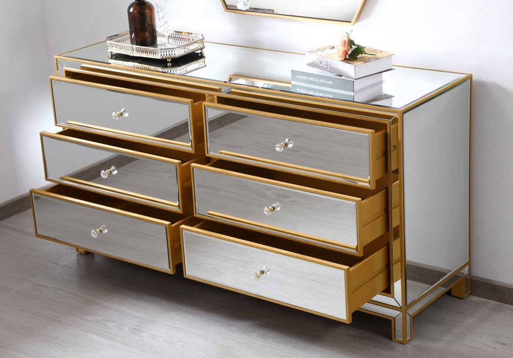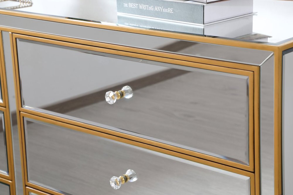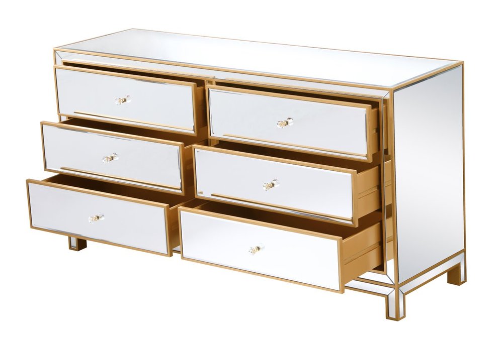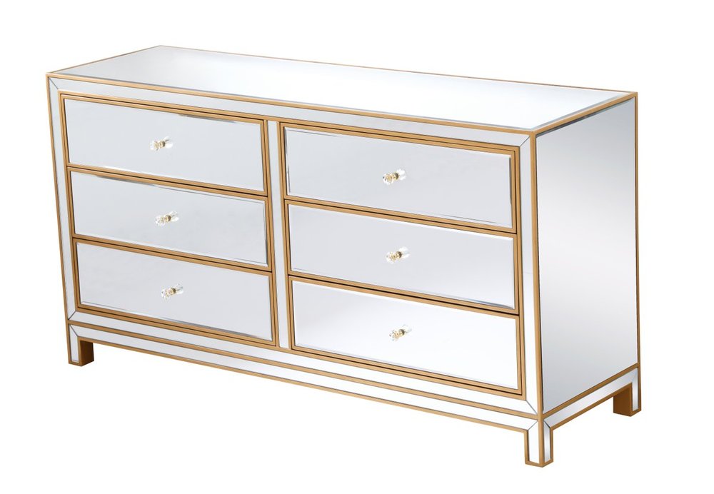 Sophisticated with a reflective touch, this 60” wide contemporary cabinet adds style and functionality to your home. Six deep drawers provide ample storage space, each decorated with a square brushed steel knob. Distinctively designed with mitered corners, all surfaces are inlaid with mirror panels. This contemporary cabinet enhances the brightness and ambience in your room. FEATURES: *Reflexion collection *6 drawers * Brushed steel drawer knobs *Hand brushed gold *Beveled mirror panel *Solid wood frame and legs *Wood drawer glides *drawer lining painted in gold. PRODUCT DETAILS: Measurement W60xD18xH32” *No assembly required *Material in solid wood and engineered wood *1 year limited product warranty.