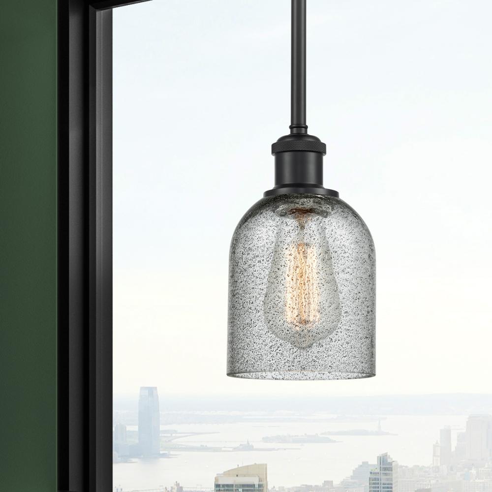 A sparkling combination of black and grey grit particles are infused in clear glass while hand blown for a mid century feel. Solid Brass 90 Degree Hang Straight Swivel for Sloped Ceilings Included
