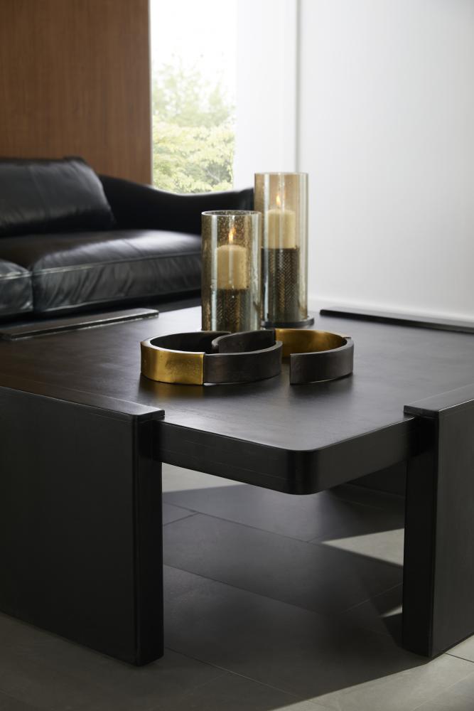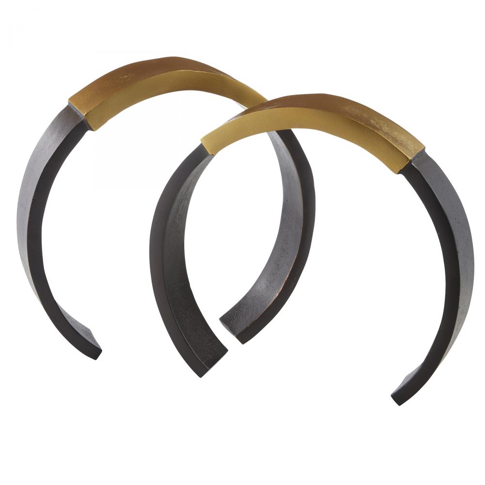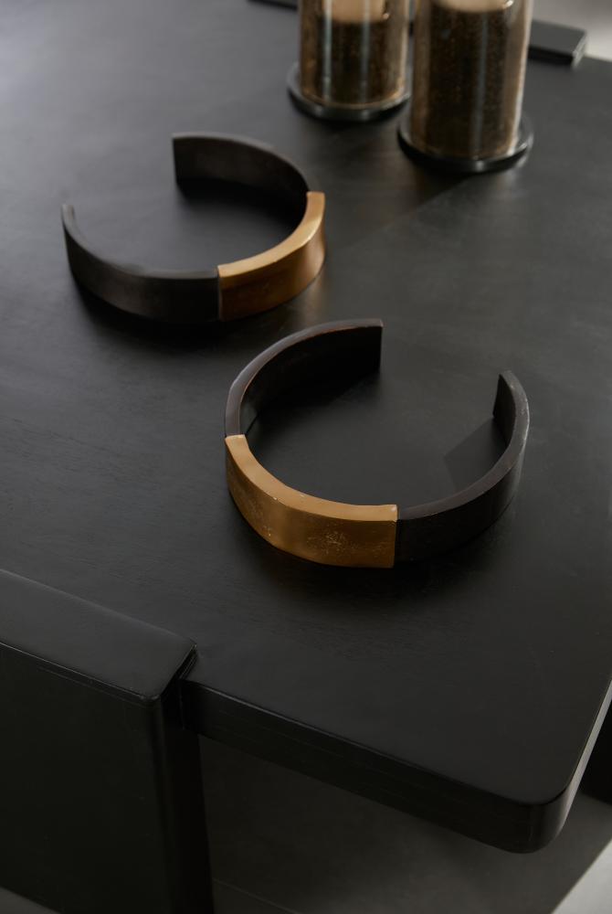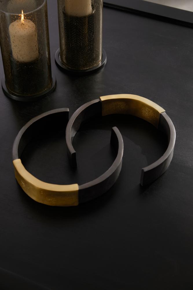 Rings of antique brass and bronze aluminum recall antique cuff bracelets or broken chains. These powerful yet simplistic forms were designed to be displayed stacked or placed alongside one another for visual interest. Finish will vary.