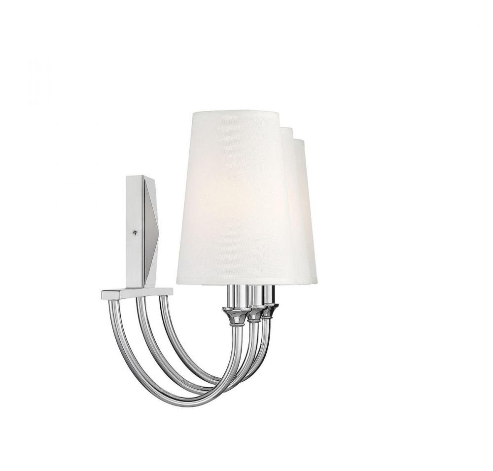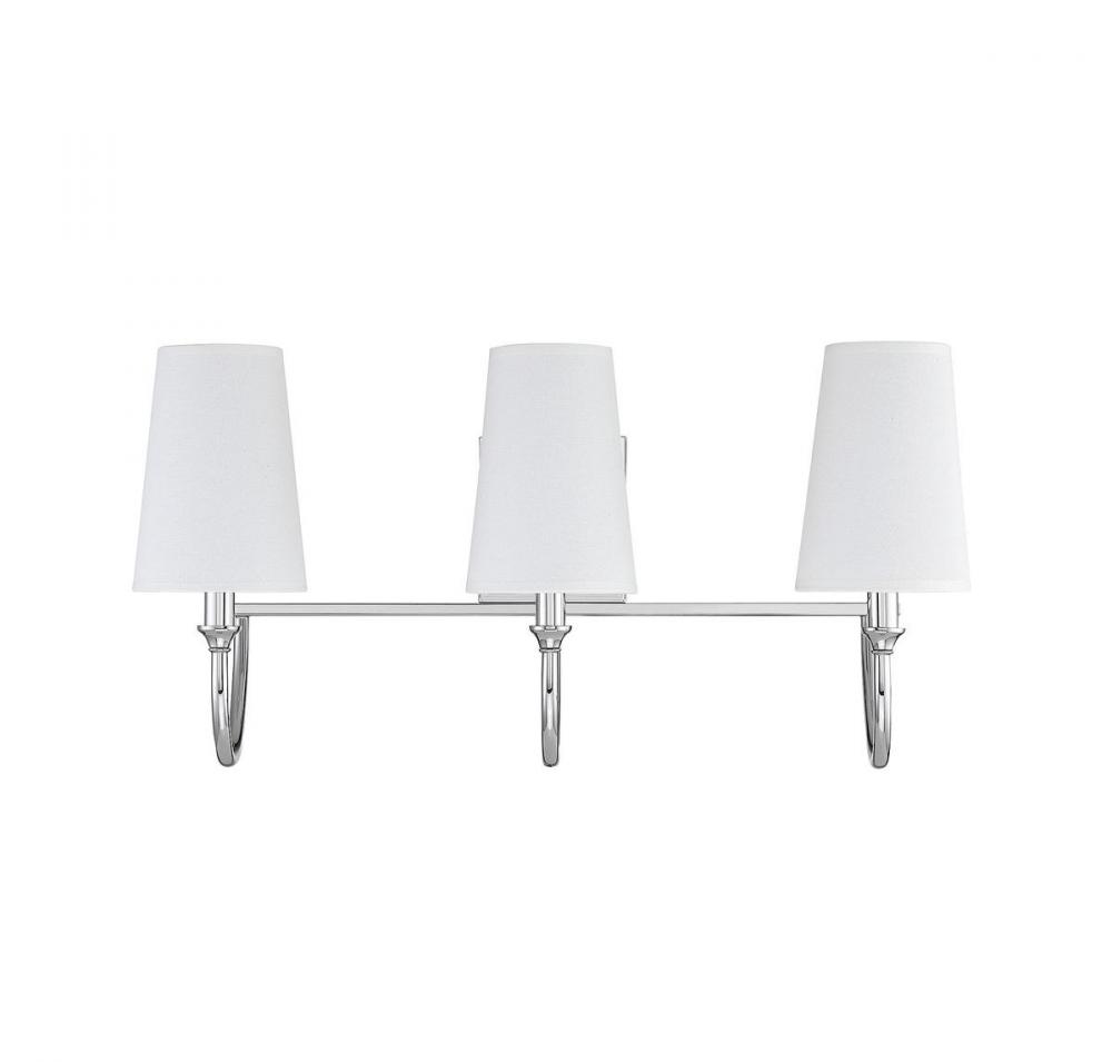 Bring the understated, classic beauty of the Savoy House Cameron 3-light bath bar into your home to create a thoughtful accent in any bathroom. This vanitylight features slender, dramatically-curving arms topped with tall, tapered white fabric shades, ensuring a flattering glow. The faceted backplate adds another dimension of style, too. Finished in polished nickel. This fixture is 24" wide and 12" tall. It extends 8" from the wall. Uses 3 candelabra size bulbs of up to 40 watts each (not included).