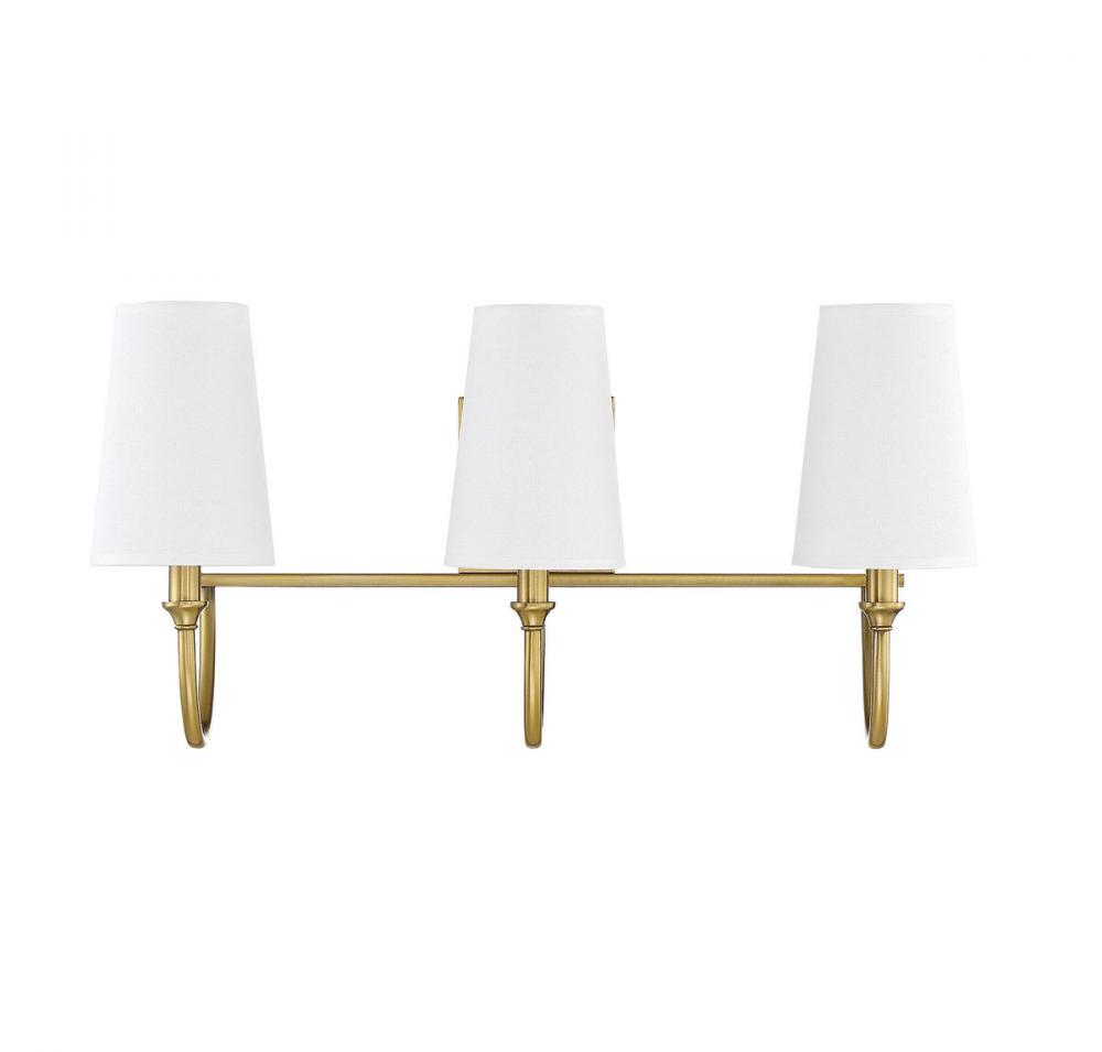 Bring the understated, classic beauty of the Savoy House Cameron 3-light bath bar into your home to create a thoughtful accent in any bathroom. This vanity light features slender, dramatically-curving arms topped with tall, tapered white fabric shades, ensuring a flattering glow. The faceted backplate adds another dimension of style, too. Finished in warm brass. This fixture is 24" wide and 12" tall. It extends 8" from the wall. Uses 3 candelabra size bulbs of up to 40 watts each (not included).